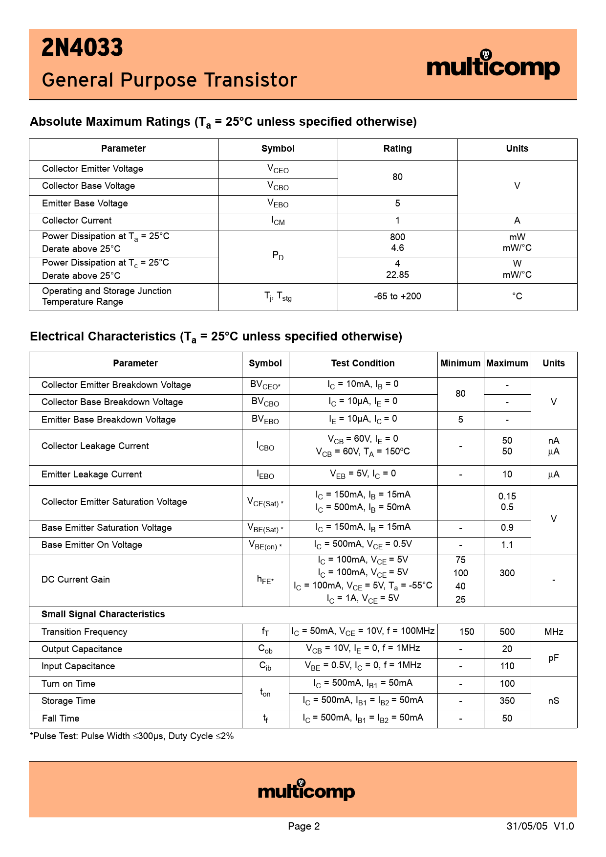 Collector Emitter Voltage VCEO 80 Collector Base Voltage VCBO V Emitter Base Voltage VEBO 5 Collector Current ICM 1 A Power Dissipation at Ta = 25°C 800 mW Derate above 25°C 4.6 mW/°C PD Power Dissipation at Tc = 25°C 4 W Derate above 25°C 22.85 mW/°C Operating and Storage Junction T Temperature Range j, Tstg -65 to +200 °C