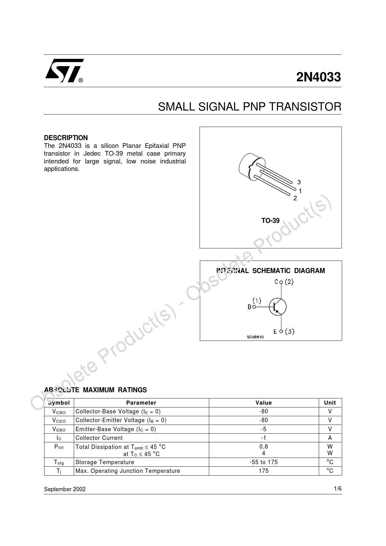 2N4033. DESCRIPTION. TO-39. INTERNAL SCHEMATIC DIAGRAM. ABSOLUTE MAXIMUM RATINGS. Symbol. Parameter. Value. Unit