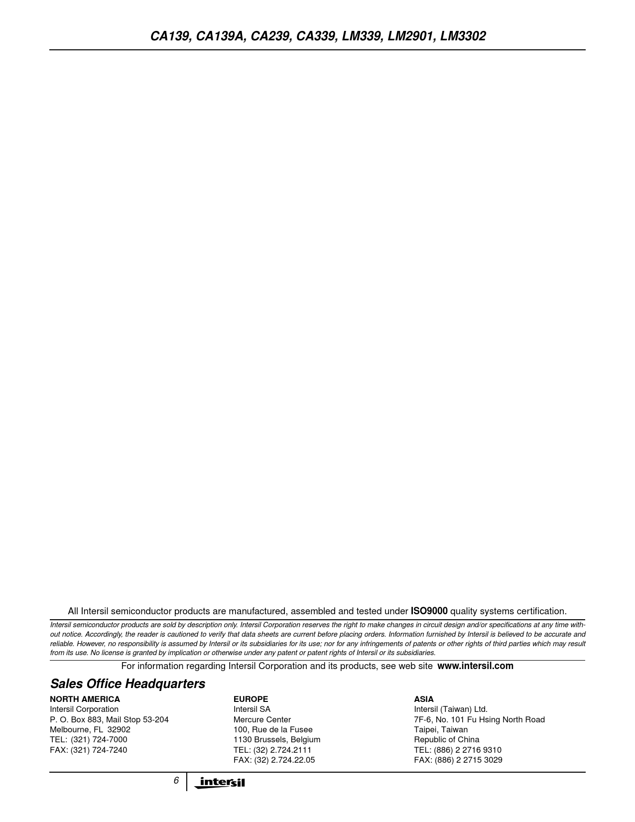 CA139, CA139A, CA239, CA339, LM339, LM2901, LM3302. ISO9000. www.intersil.com. Sales Office Headquarters. NORTH AMERICA. EUROPE