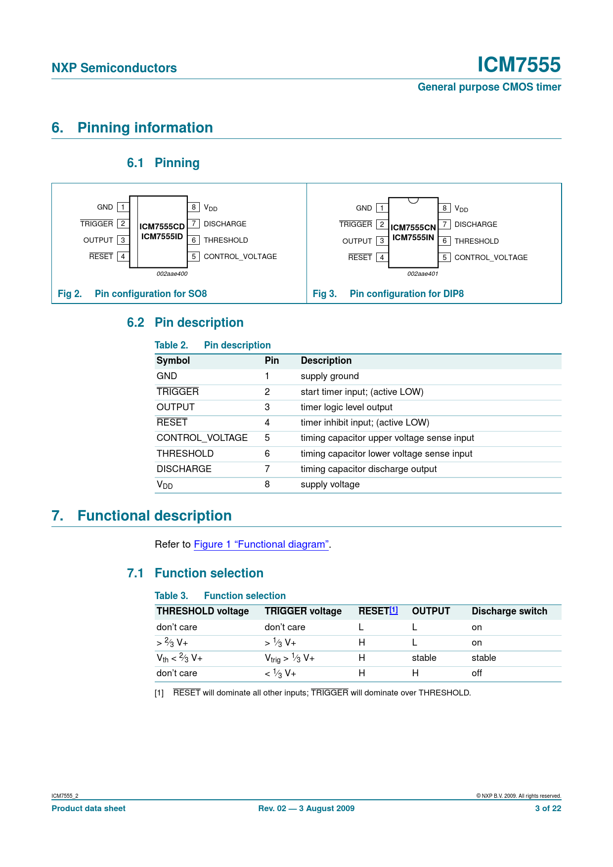 | Páginas / Página | 22 / 3 — NXP Semiconductors. ICM7555. General purpose CMOS timer. Pinning … |
