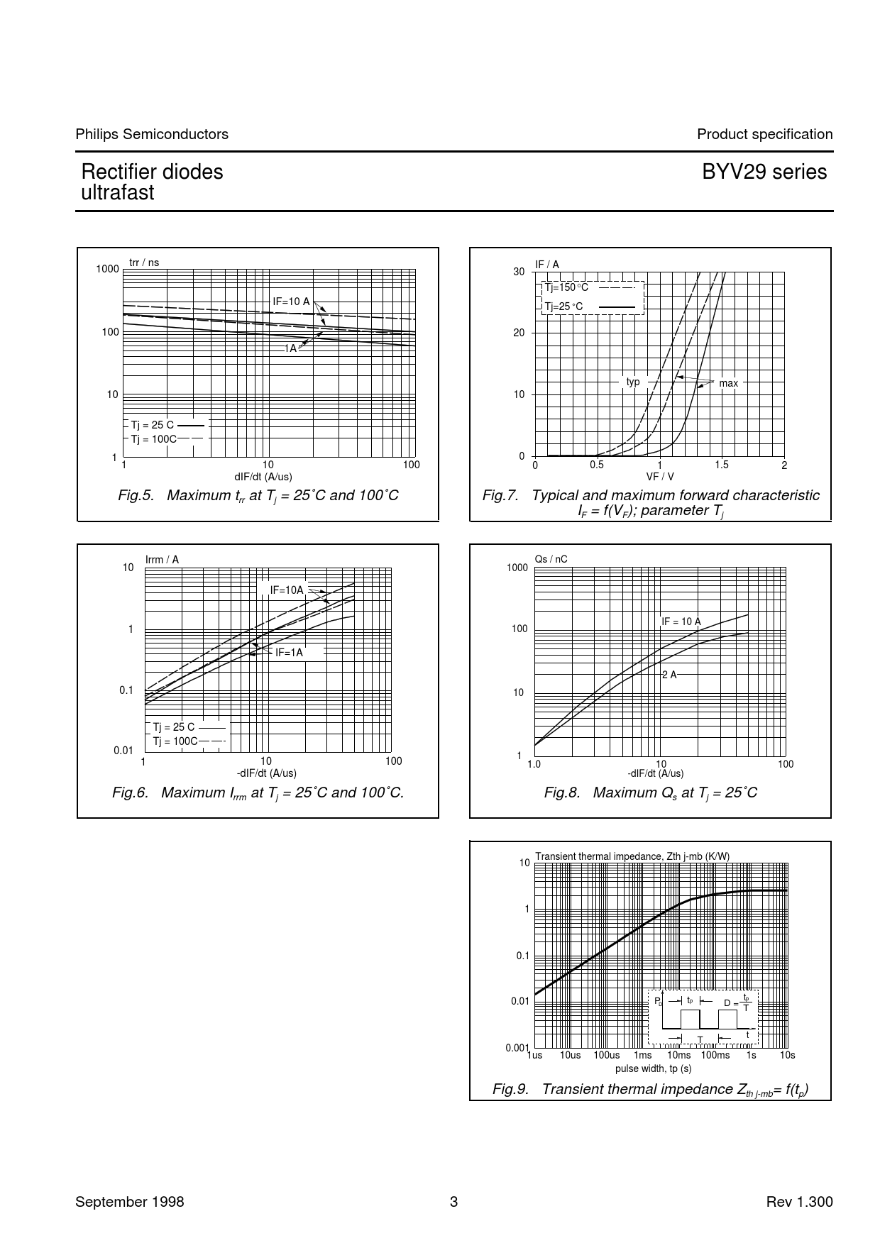 Philips. Semiconductors. Product. specification. Rectifier. diodes. BYV29. series. ultrafast. trr. /. ns. 1000. IF. /. A. BYW29. 30. Tj=150. C. IF=10. A. Tj=25. C. 100