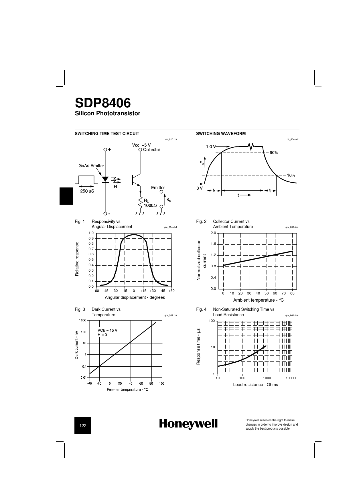 cir_015.cdr cir_004.cdr Fig. 1 Responsivity vs Fig. 2 Collector Current vs Angular Displacement gra_054.ds4 Ambient Temperature gra_039.ds4 1.0 2.0 0.9 r e s 0.8 to 1.6 n c o 0.7 p lle s 0.6 o t c n 1.2 re 0.5 d e e rre tiv 0.4 liz u c 0.8 la a e 0.3 R rm 0.2 o N 0.4 0.1 0.0 0.0 -60 -45 -30 -15 0 +15 +30 +45 +60 0 10 20 30 40 50 60 70 80 Angular displacement - degrees Ambient temperature - °C Fig. 3 Dark Current vs Fig. 4 Non-Saturated Switching Time vs Temperature gra_301.cdr Load Resistance gra_041.ds4 100 s - µ e tim e s 10 n o p s e R 1 10 100 1000 10000 Load resistance - Ohms Honeywell reserves the right to make changes in order to improve design and 122 h supply the best products possible.