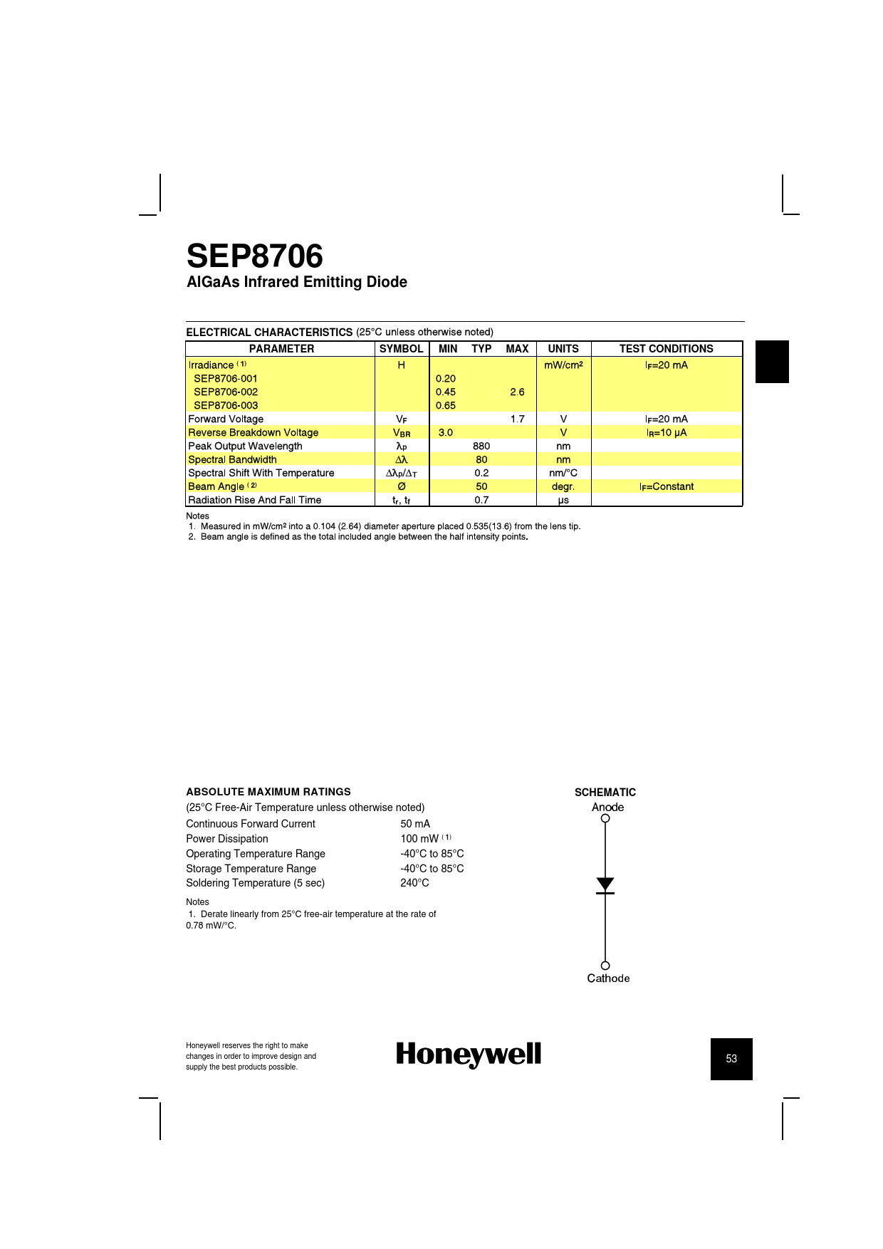 SEP8706 AlGaAs Infrared Emitting DiodeELECTRICAL CHARACTERISTICSPARAMETERSYMBOLMINTYPMAXUNITSTEST CONDITIONSABSOLUTE MAXIMUM RATINGSSCHEMATIC (25¡C Free-Air Temperature unless otherwise noted) Continuous Forward Current 50 mA Power Dissipation 100 mW [À] Operating Temperature Range -40¡C to 85¡C Storage Temperature Range -40¡C to 85¡C Soldering Temperature (5 sec) 240¡C Notes 1. Derate linearly from 25¡C free-air temperature at the rate of 0.78 mW/¡C. Honeywell reserves the right to make changes in order to improve design and h 53 supply the best products possible.