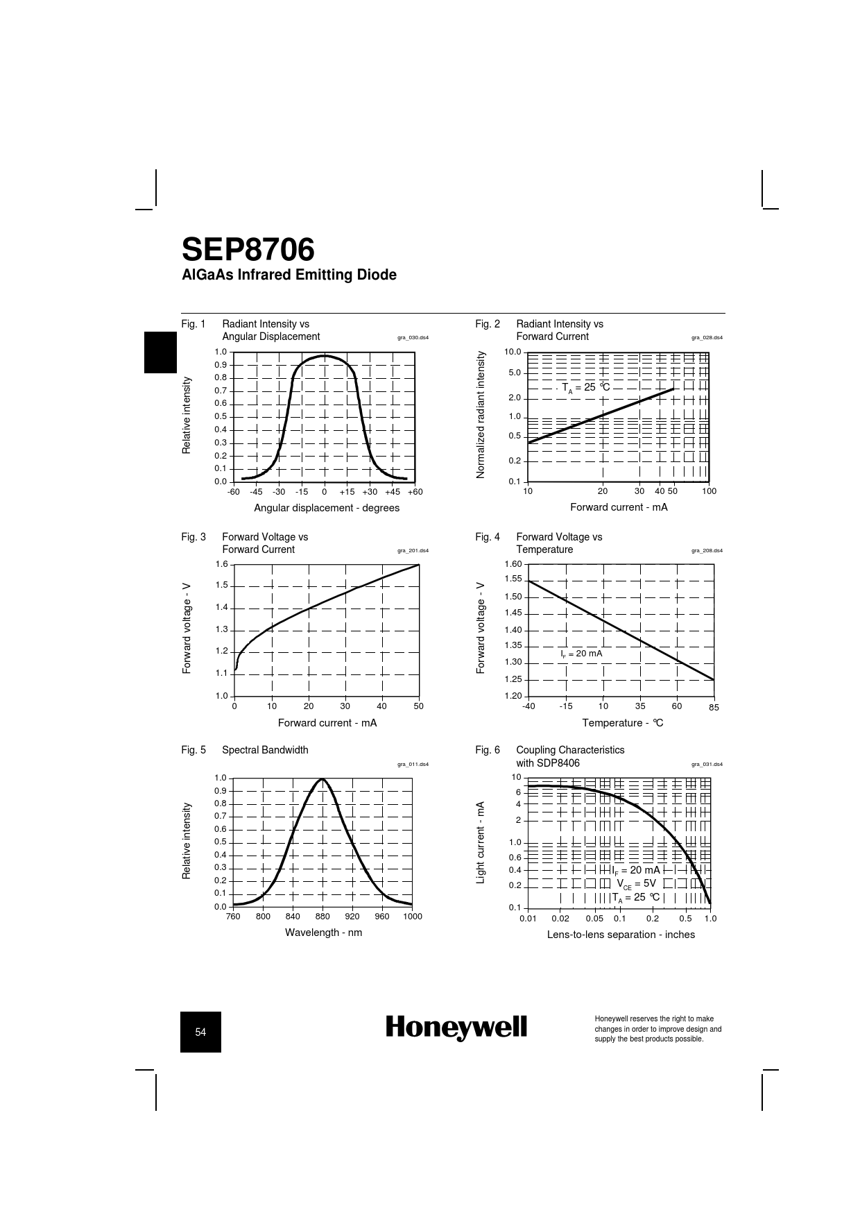 SEP8706 AlGaAs Infrared Emitting Diode Fig. 1 Radiant Intensity vs Fig. 2 Radiant Intensity vs Angular Displacement gra_030.ds4 Forward Current gra_028.ds4 1.0 10.0 ity 0.9 s n 5.0 0.8 te ity s T = 25 °C n 0.7 t in A n 2.0 te 0.6 ia in d e 0.5 1.0 ra tiv 0.4 d la e 0.5 e 0.3 liz R a 0.2 rm 0.2 0.1 o N 0.0 0.1 -60 -45 -30 -15 0 +15 +30 +45 +60 10 20 30 40 50 100 Angular displacement - degrees Forward current - mA Fig. 3 Forward Voltage vs Fig. 4 Forward Voltage vs Forward Current gra_201.ds4 Temperature gra_208.ds4 1.6 1.60 1.55 1.5 - V - V 1.50 e e g 1.4 g 1.45 lta lta o o v 1.3 v 1.40 rd rd a 1.35 1.2 a I = 20 mA rw rw F o o 1.30 F 1.1 F 1.25 1.0 1.20 0 10 20 30 40 50 -40 -15 10 35 60 85 Forward current - mA Temperature - °C Fig. 5 Spectral Bandwidth Fig. 6 Coupling Characteristics gra_011.ds4 with SDP8406 gra_031.ds4 1.0 10 0.9 6 0.8 4 ity A s n 0.7 2 te 0.6 t - m n in e 0.5 rre 1.0 u tiv 0.4 0.6 la t c e 0.3 h 0.4 I = 20 mA R ig F 0.2 L 0.2 V = 5V CE 0.1 T = 25 °C A 0.0 0.1 760 800 840 880 920 960 1000 0.01 0.02 0.05 0.1 0.2 0.5 1.0 Wavelength - nm Lens-to-lens separation - inches Honeywell reserves the right to make changes in order to improve design and 54 h supply the best products possible.
