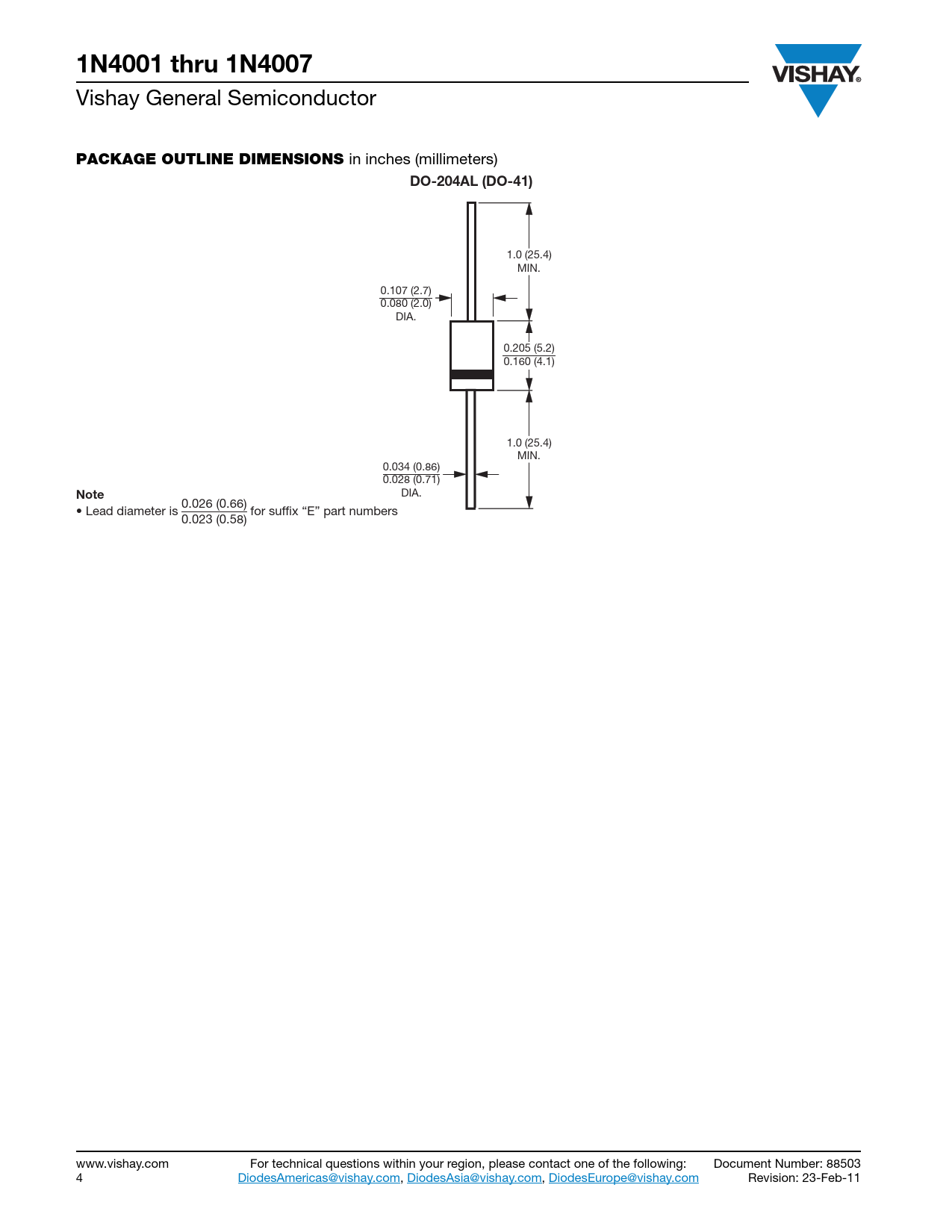 1N4001 thru 1N4007 Vishay General Semiconductor PACKAGE OUTLINE DIMENSIONS in inches (millimeters) DO-204AL (DO-41) 1.0 (25.4) MIN. 0.107 (2.7) 0.080 (2.0) DIA. 0.205 (5.2) 0.160 (4.1) 1.0 (25.4) MIN. 0.034 (0.86) 0.028 (0.71) DIA. Note 0.026 (0.66) • Lead diameter is for suffix “E” part numbers 0.023 (0.58) www.vishay.com For technical questions within your region, please contact one of the following: Document Number: 88503 4 DiodesAmericas@vishay.com, DiodesAsia@vishay.com, DiodesEurope@vishay.com Revision: 23-Feb-11