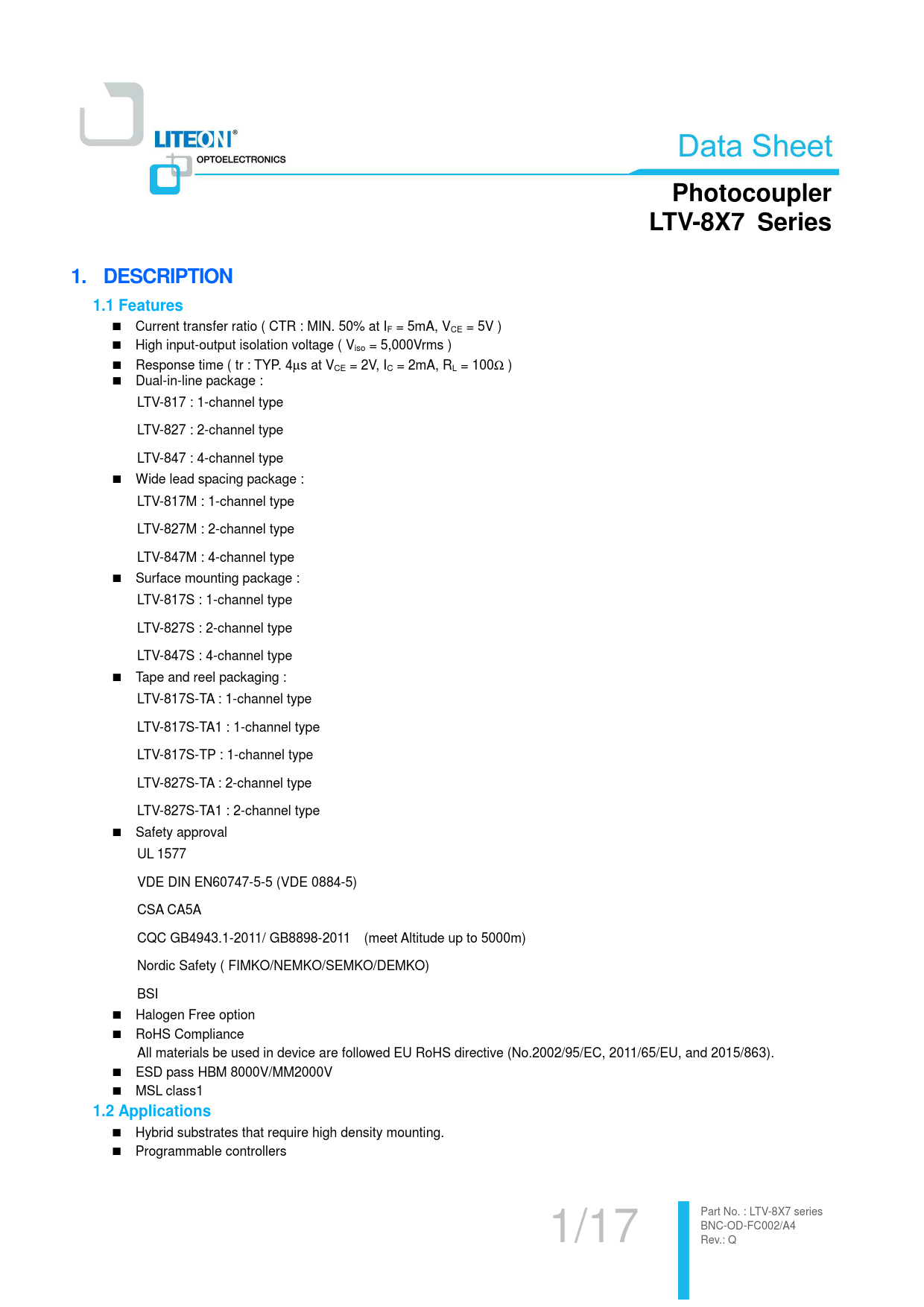 Photocoupler LTV-8X7 Series 1 DESCRIPTION 1.1 Features 1.2 Applications