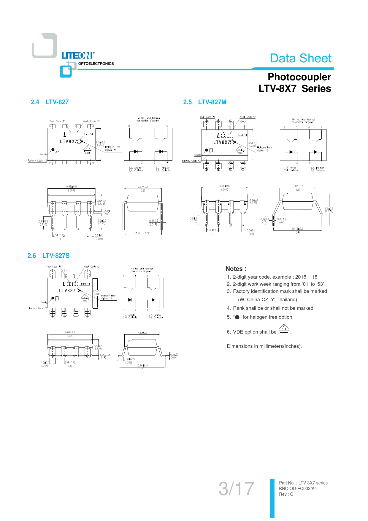 PhotocouplerLTV-8X7 Series2.4 LTV-827 2.5 LTV-827M2.6 LTV-827SNotes : 1. 2-digit year code, example : 2016 = 16 2. 2-digit work week ranging from ‘01’ to ‘53’ 3. Factory identification mark shall be marked (W: China-CZ, Y: Thailand) 4. Rank shall be or shall not be marked. 5. “●” for halogen free option. 6. VDE option shall be . Dimensions in millimeters(inches). 3/17 P art N o. : L TV-8 X7 s eries BNC-OD-FC002/A4 Rev.: Q