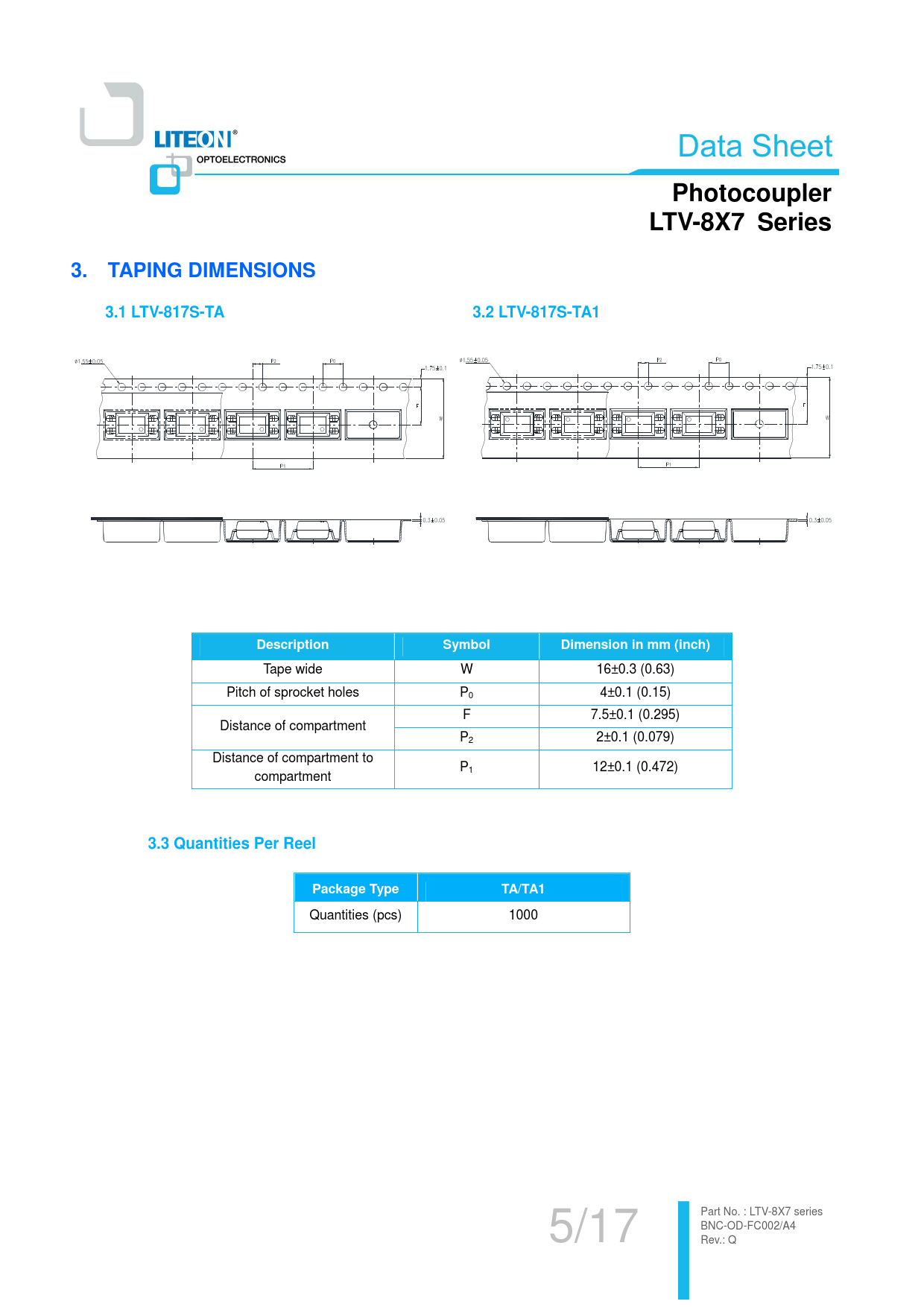 Photocoupler LTV-8X7 Series 3 TAPING DIMENSIONS 3.1 LTV-817S-TA 3.2 LTV-817S-TA1 Description Symbol Dimension in mm (inch)