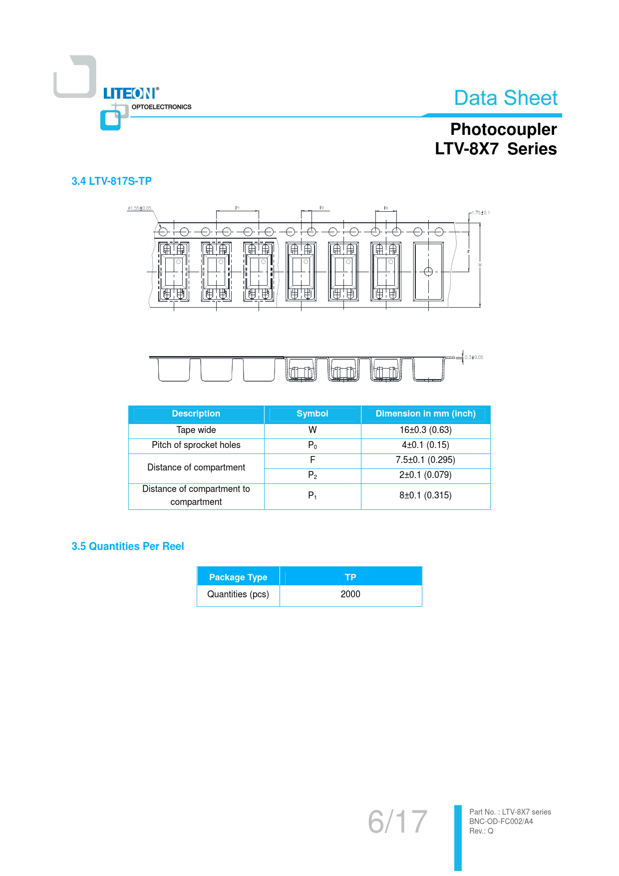 Photocoupler LTV-8X7 Series 3.4 LTV-817S-TP Description Symbol Dimension in mm (inch) 3.5 Quantities Per Reel Package Type