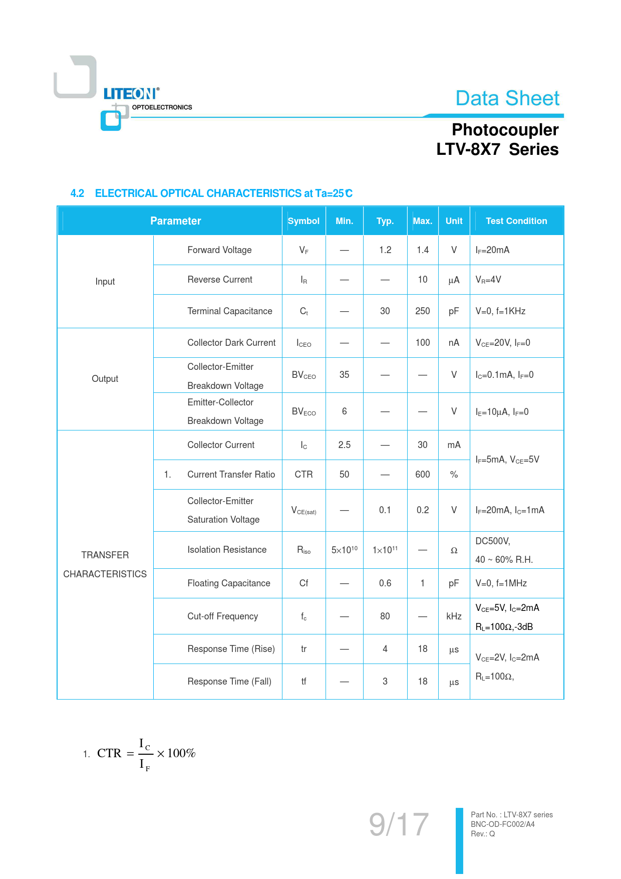 Photocoupler. LTV-8X7 Series. 4.2. ELECTRICAL OPTICAL CHARACTERISTICS at Ta=25°C. Parameter. Symbol. Min. Typ. Max. Unit. Test Condition