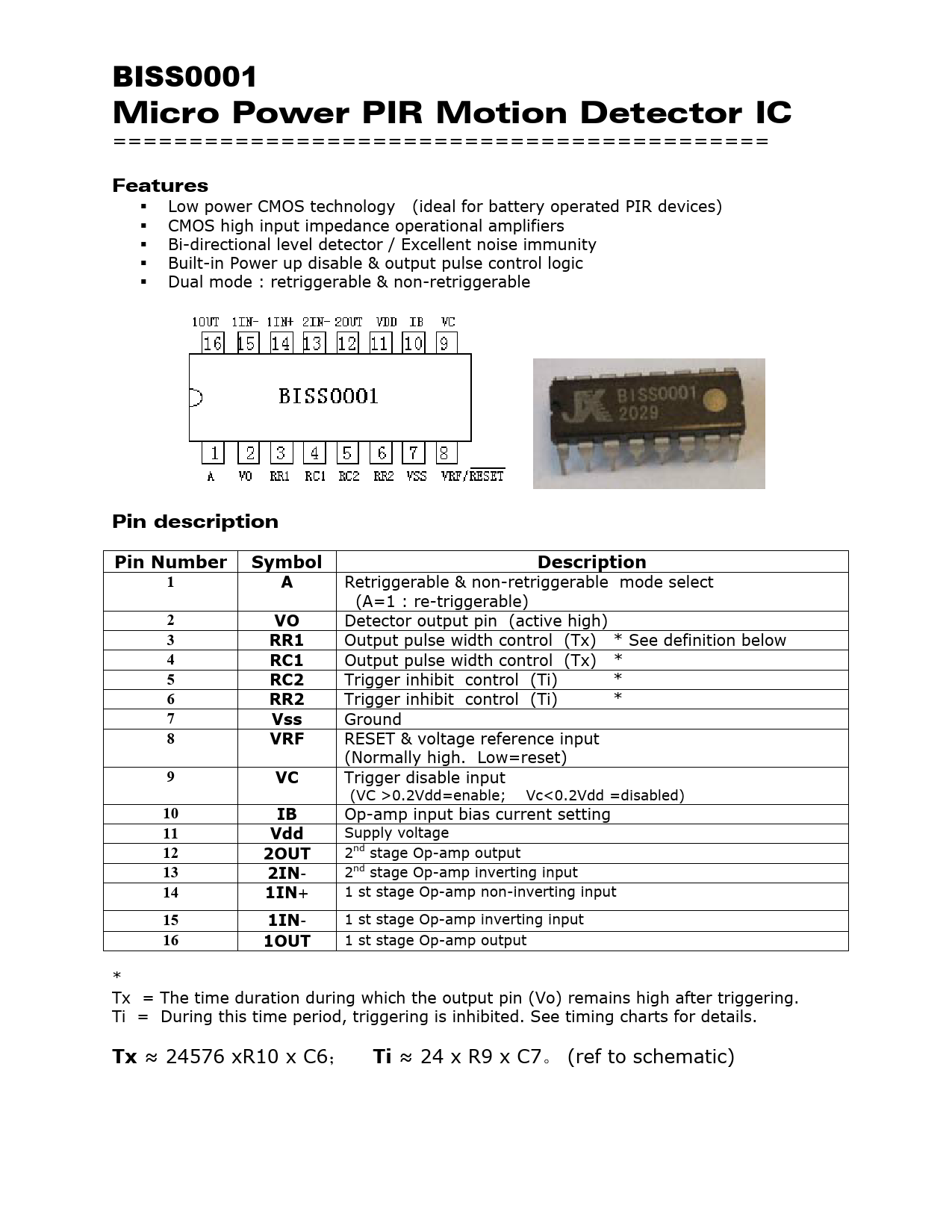 BISS0001 Micro Power PIR Motion Detector IC =========================================== Features Low power CMOS technology (ideal for battery operated PIR devices) CMOS high input impedance operational amplifiers Bi-directional level detector / Excellent noise immunity Built-in Power up disable & output pulse control logic Dual mode : retriggerable & non-retriggerable Pin description
