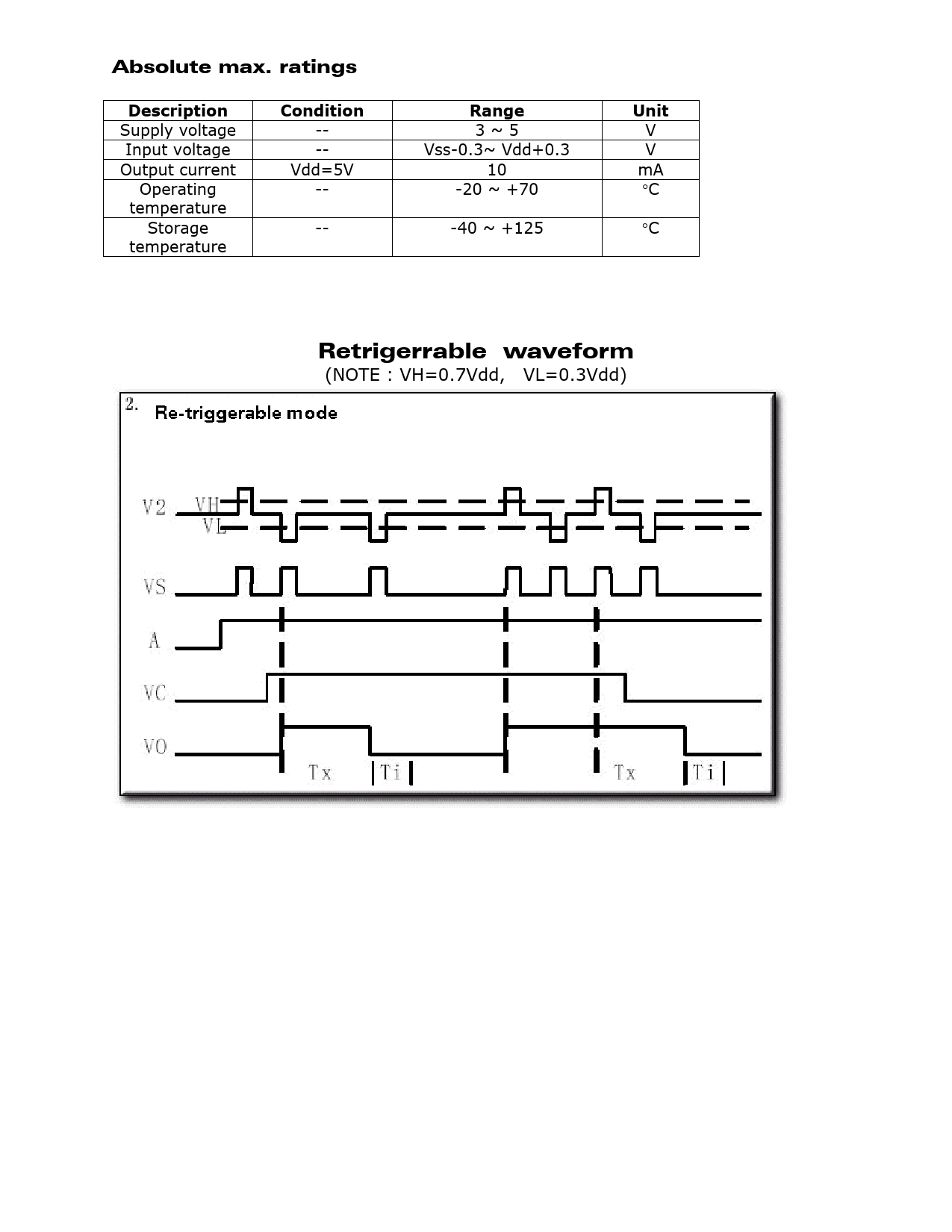 Supply voltage -- 3 ~ 5 V Input voltage -- Vss-0.3~ Vdd+0.3 V Output current Vdd=5V 10 mA Operating -- -20 ~ +70 °C temperature Storage -- -40 ~ +125 °C temperature Retrigerrable waveform (NOTE : VH=0.7Vdd, VL=0.3Vdd) Document Outline High Performance PIR Motion Detector IC Symbol A Retrigerrable waveform(NOTE : VH=0.7Vdd, VL=0.3Vdd) Non-retriggerable waveform(NOTE : VH=0.7Vdd, VL=0.3Vdd)