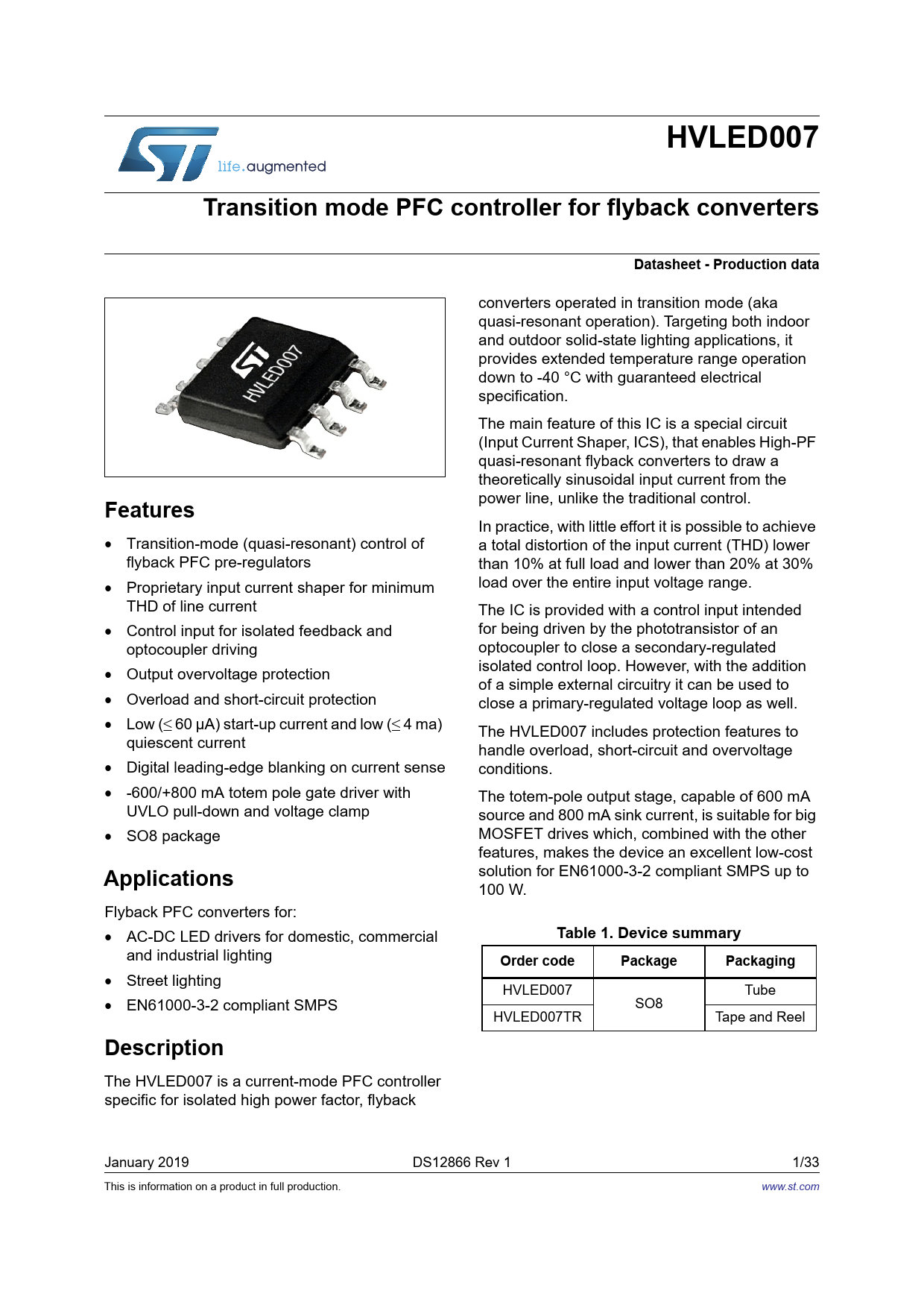 The HVLED007 is a current-mode PFC controller specific for isolated high power factor, flyback January 2019 DS12866 Rev 1 1/33 This is information on a product in full production. www.st.com Document Outline Table 1. Device summary 1 Block diagram Figure 1. Block diagram Table 2. Absolute maximum ratings 2 Pin connections Figure 2. Pin connection (top view) Table 3. Thermal data Table 4. Pin functions (continued) 3 Electrical characteristics Table 5. Electrical characteristics (continued) 4 Application information 4.1 Introduction Figure 3. Input current distortion in Hi-PF QR flyback converters with traditional TM control: current shape and resulting total harmonic distortion and power factor vs. Kv (= Vinpk/VR) ratio 4.2 Input current shaping function - operating principle Figure 4. Hi-PF QR flyback converter with the traditional TM control: current waveforms Figure 5. Input current shaper (ICS) block and its interconnection with HVLED007 control Figure 6. Key waveforms of the ICS circuit in figure 5 Figure 7. Shape of the current reference Vcsref(θ) (5) at different input voltages (i.e. Kv values) 4.3 Operation of a Hi-PF QR flyback converter based on the HVLED007 Table 6. Timing quantities in a HVLED007-based Hi-PF QR flyback converter Table 7. Control quantities in a HVLED007-based Hi-PF QR flyback converter Table 8. Electrical quantities in a HVLED007-based Hi-PF QR flyback converter 4.4 Shaping capacitor (Ct) selection (pin CT) 4.5 Control input for isolated feedback and optocoupler driving (pin COMP) Figure 8. Output characteristic of pin COMP and significant levels 4.6 Multiplier input for input voltage sensing (pin MULT) 4.7 Current sensing input (pin CS). Sense resistor (Rs) selection Figure 9. Effect of ripple on Ct on current sense signal: a) within linear dynamics, close to clamp level; b) signal slightly exceeding clamp level; c) signal exceeding clamp level, with OCP activation 4.8 Zero current detection and triggering block (pin ZCD); starter 4.9 Overload and short-circuit protection (OCP function) Figure 10. Functional schematic of the overload and short-circuit protection function 4.10 Overvoltage protection (OVP function) Figure 11. Functional schematic of the OVP function 4.11 Soft-restart function Figure 12. Functional schematic of the soft restart function 4.12 Suggested step-by-step design procedure of a Hi-PF QR flyback converter based on the HVLED0007 Table 9. Basic electrical specification and key parameters of a Hi-PF QR flyback Figure 13. Typical application schematic (reference for suggested design procedure) 5 Referenced documents 6 Package information Table 10. SO-8 mechanical data Figure 14. Package dimensions 7 Revision history Table 11. Document history