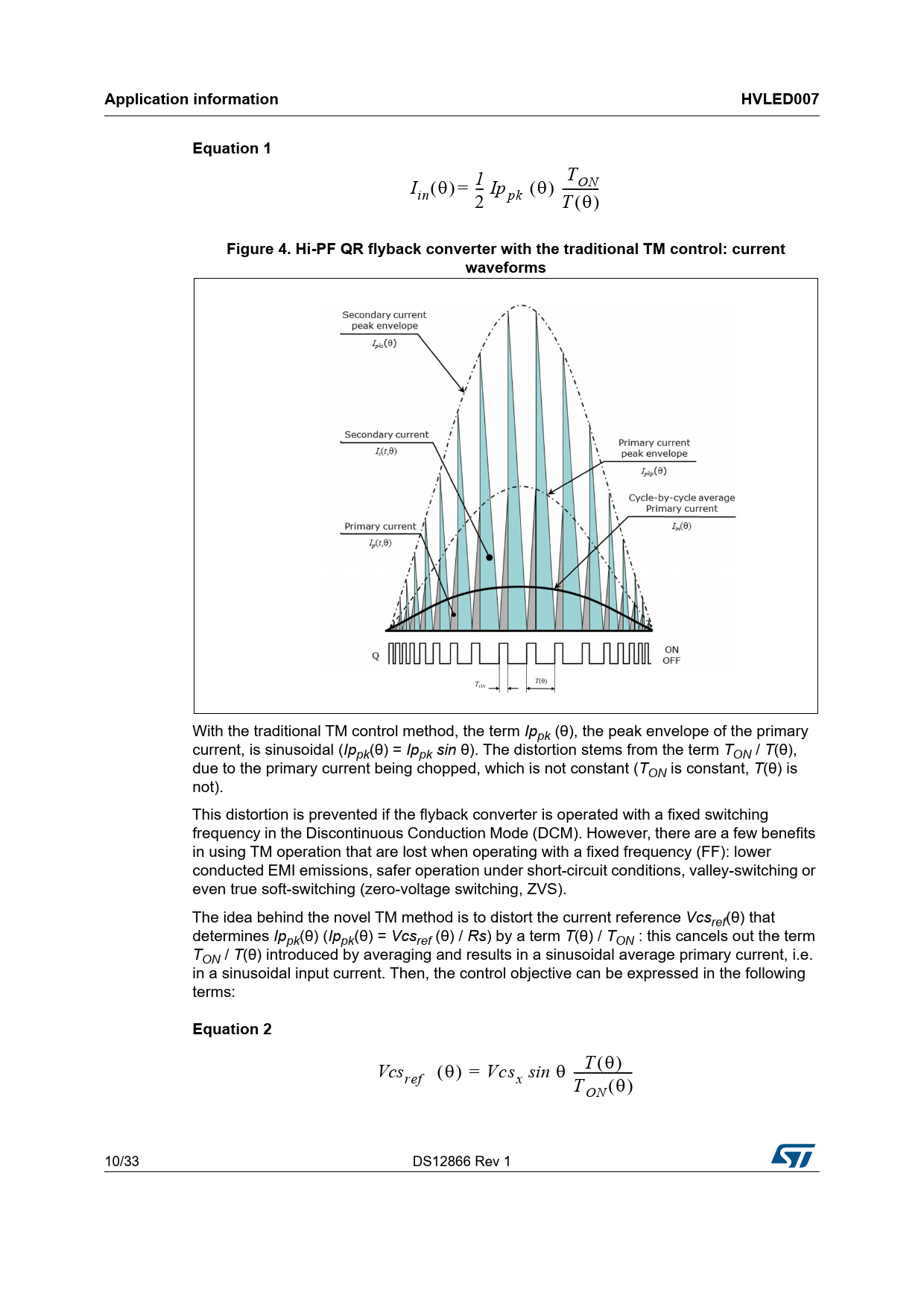 Páginas / Página33 / 10 — Application information. HVLED007. Equation 1. Figure 4. Hi-PF QR flyback …