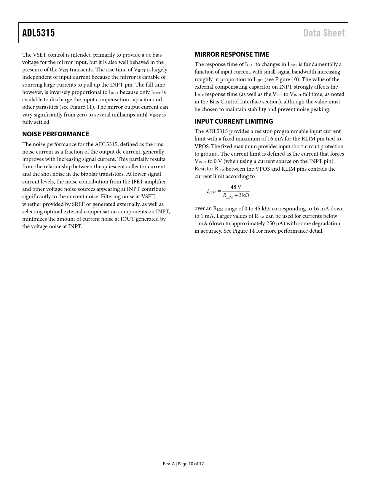 Páginas / Página17 / 10 — ADL5315. Data Sheet. MIRROR RESPONSE TIME. INPUT CURRENT LIMITING. NOISE …