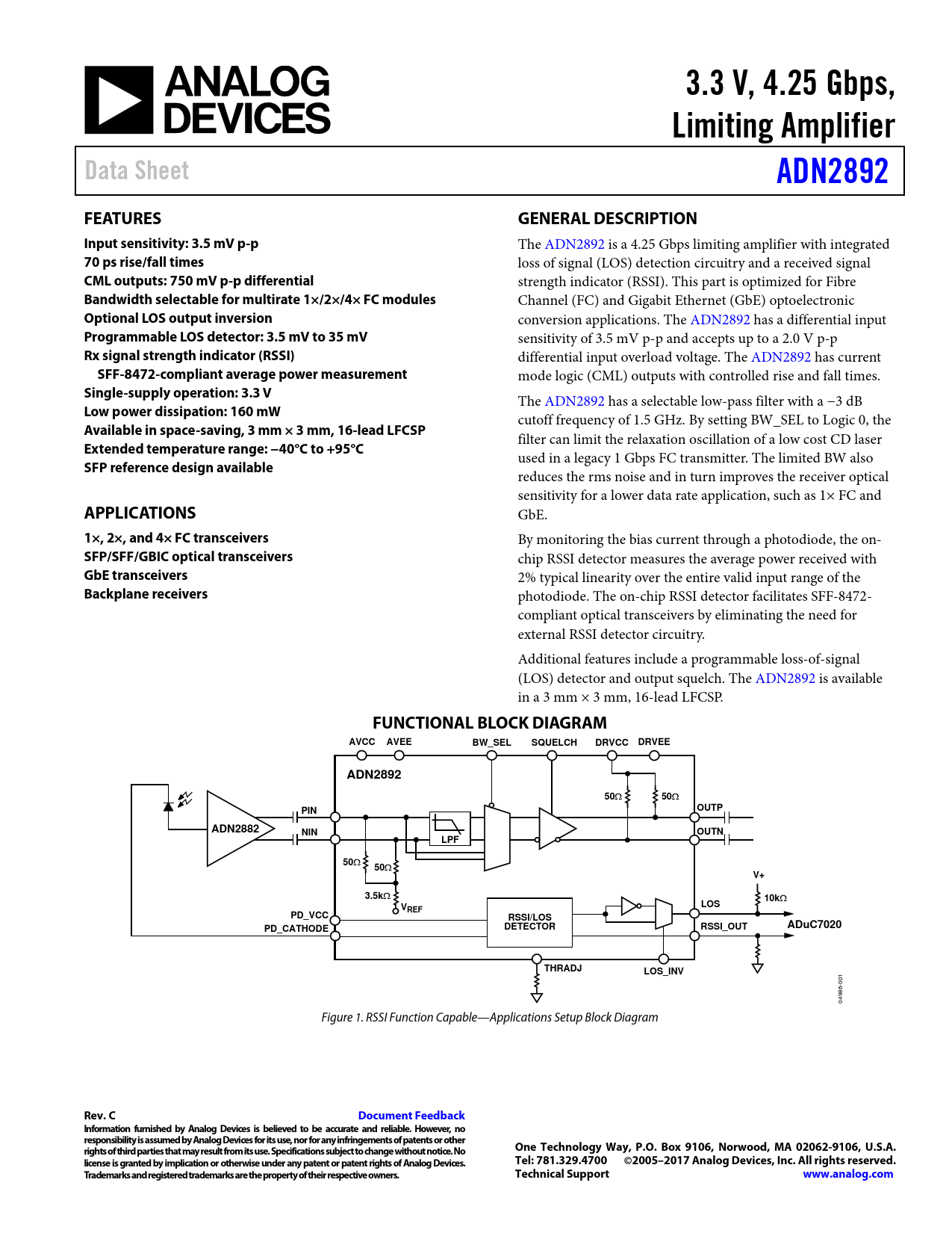photodiode. The on-chip RSSI detector facilitates SFF-8472- compliant optical transceivers by eliminating the need for external RSSI detector circuitry. Additional features include a programmable loss-of-signal (LOS) detector and output squelch. The ADN2892 is available in a 3 mm × 3 mm, 16-lead LFCSP.