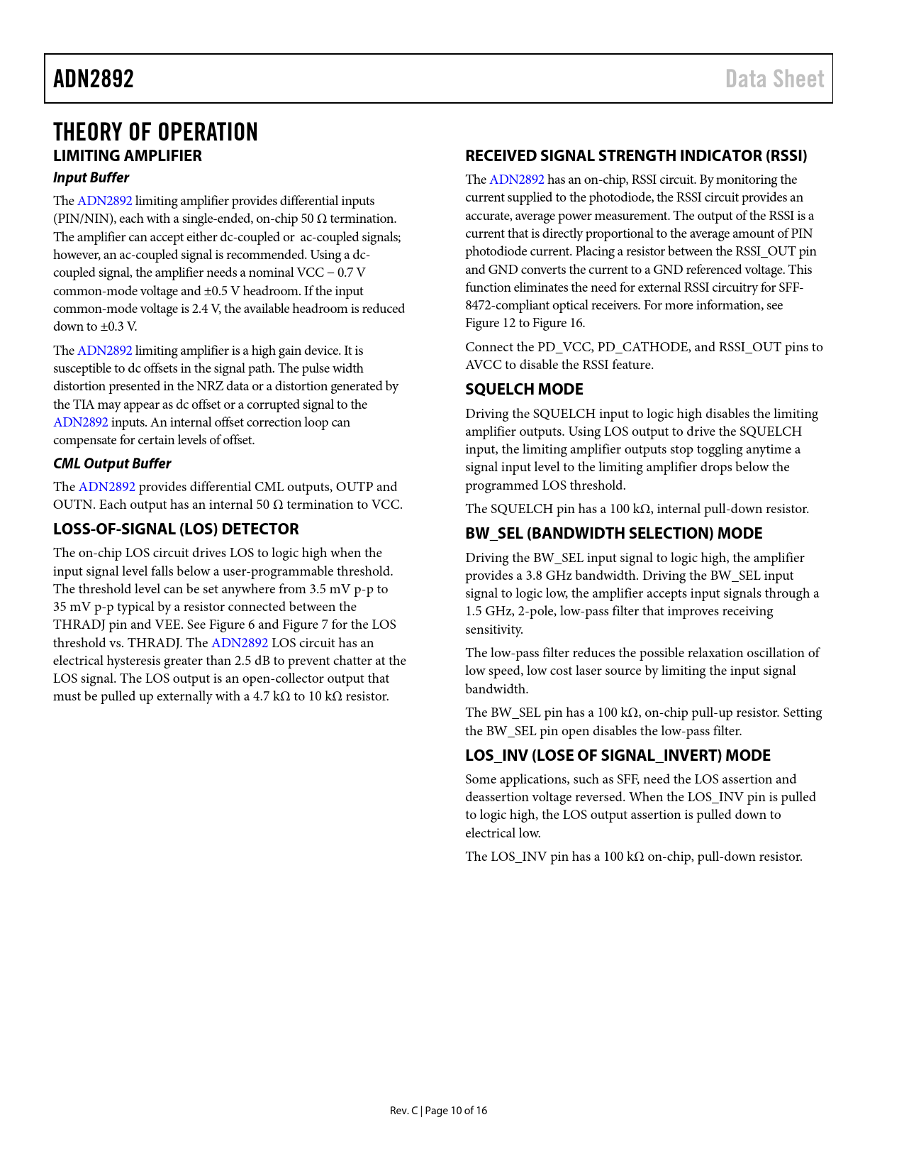 Páginas / Página16 / 10 — ADN2892. Data Sheet. THEORY OF OPERATION LIMITING AMPLIFIER. RECEIVED …