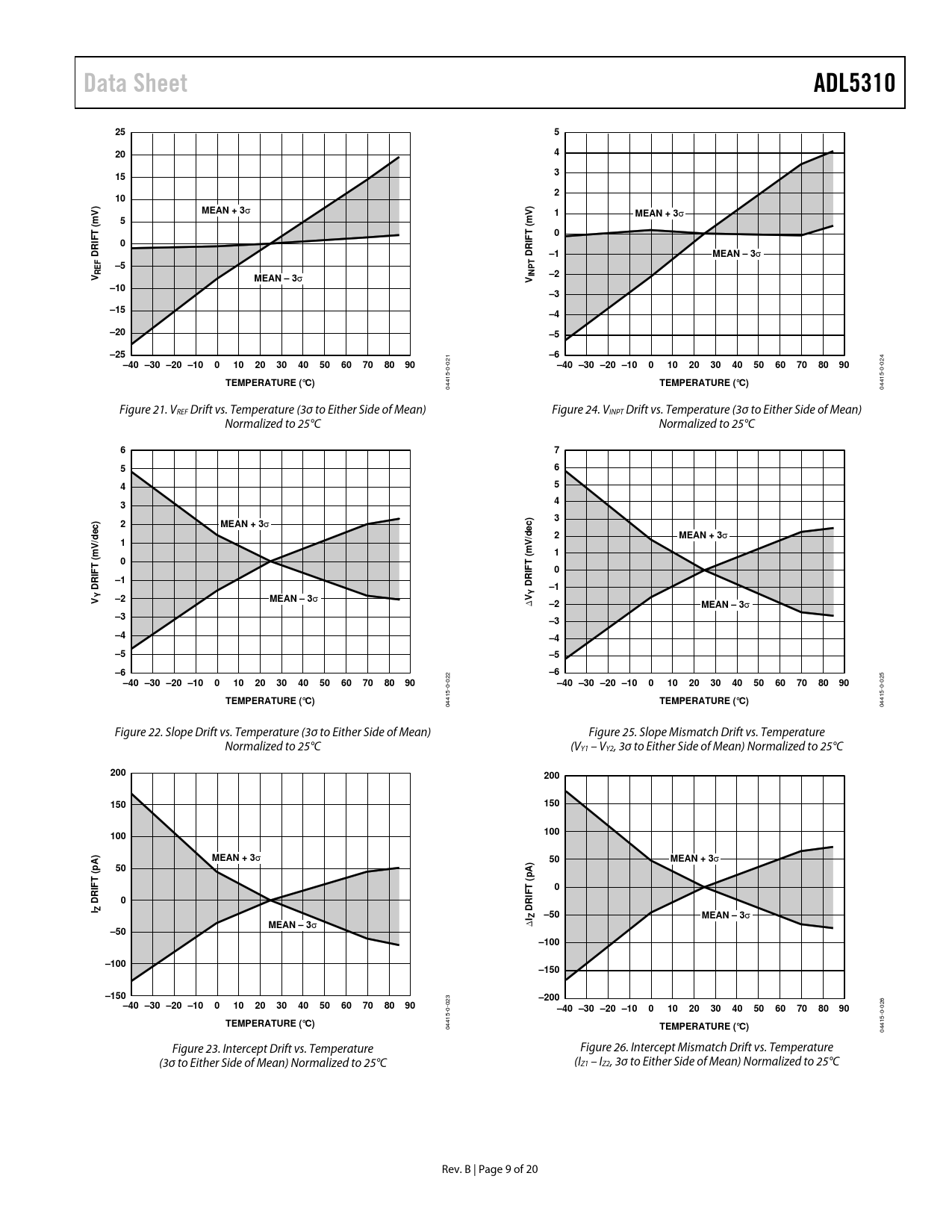 Data SheetADL5310255204153210MEAN + 3 σ 1MEAN + 3 σ 500DRIFT (mV)–1DRIFT (mV)MEAN – 3 σ –5REFVINPT–2MEAN – 3 σ V–10–3–15–4–20–5–25–6–40 –30 –20 –100102030405060708090–40 –30 –20 –100102030405060708090TEMPERATURE (°C)TEMPERATURE (°C) 04415-0-021 04415-0-024 Figure 21. VREF Drift vs. Temperature (3σ to Either Side of Mean) Figure 24. VINPT Drift vs. Temperature (3σ to Either Side of Mean) Normalized to 25°C Normalized to 25°C 6756454332MEAN + 3 σ 2MEAN + 3 σ 1100–1DRIFT (mV/dec)DRIFT (mV/dec)–1YY–2VMEAN – 3 σ ∆ V–2MEAN – 3 σ –3–3–4–4–5–5–6–6–40 –30 –20 –100102030405060708090–40 –30 –20 –100102030405060708090TEMPERATURE (°C)TEMPERATURE (°C) 04415-0-022 04415-0-025 Figure 22. Slope Drift vs. Temperature (3σ to Either Side of Mean) Figure 25. Slope Mismatch Drift vs. Temperature Normalized to 25°C (VY1 – VY2, 3σ to Either Side of Mean) Normalized to 25°C 200200150150100100MEAN + 3 σ 50MEAN + 3 σ 5000DRIFT (pA) I ZDRIFT (pA)–50MEAN – 3 σ MEAN – 3 σ ∆ I Z–50–100–100–150–150–200–40 –30 –20 –100102030405060708090–40 –30 –20 –100102030405060708090TEMPERATURE (°C) 04415-0-023 TEMPERATURE (°C) 04415-0-026 Figure 23. Intercept Drift vs. Temperature Figure 26. Intercept Mismatch Drift vs. Temperature (3σ to Either Side of Mean) Normalized to 25°C (IZ1 – IZ2, 3σ to Either Side of Mean) Normalized to 25°C Rev. B | Page 9 of 20 Document Outline FEATURES APPLICATIONS FUNCTIONAL BLOCK DIAGRAM GENERAL DESCRIPTION TABLE OF CONTENTS REVISION HISTORY SPECIFICATIONS ABSOLUTE MAXIMUM RATINGS ESD CAUTION PIN CONFIGURATION AND FUNCTION DESCRIPTIONS TYPICAL PERFORMANCE CHARACTERISTICS GENERAL STRUCTURE THEORY MANAGING INTERCEPT AND SLOPE RESPONSE TIME AND NOISE CONSIDERATIONS APPLICATIONS INFORMATION CALIBRATION MINIMIZING CROSSTALK RELATIVE AND ABSOLUTE POWER MEASUREMENTS CHARACTERIZATION METHODS EVALUATION BOARD OUTLINE DIMENSIONS ORDERING GUIDE