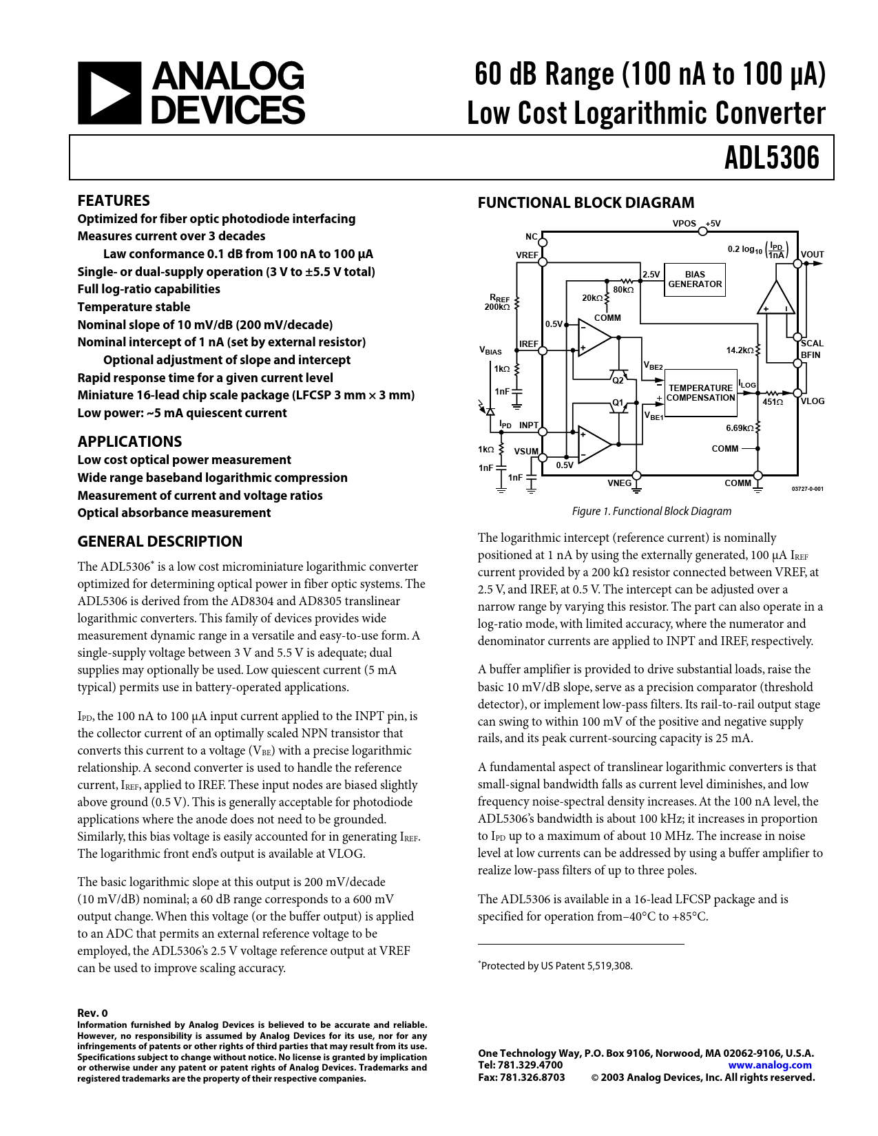 The logarithmic intercept (reference current) is nominally positioned at 1 nA by using the externally generated, 100 µA IREF The ADL5306∗ is a low cost microminiature logarithmic converter current provided by a 200 kΩ resistor connected between VREF, at optimized for determining optical power in fiber optic systems. The 2.5 V, and IREF, at 0.5 V. The intercept can be adjusted over a ADL5306 is derived from the AD8304 and AD8305 translinear narrow range by varying this resistor. The part can also operate in a logarithmic converters. This family of devices provides wide log-ratio mode, with limited accuracy, where the numerator and measurement dynamic range in a versatile and easy-to-use form. A denominator currents are applied to INPT and IREF, respectively. single-supply voltage between 3 V and 5.5 V is adequate; dual supplies may optionally be used. Low quiescent current (5 mA A buffer amplifier is provided to drive substantial loads, raise the typical) permits use in battery-operated applications. basic 10 mV/dB slope, serve as a precision comparator (threshold detector), or implement low-pass filters. Its rail-to-rail output stage IPD, the 100 nA to 100 µA input current applied to the INPT pin, is can swing to within 100 mV of the positive and negative supply the collector current of an optimally scaled NPN transistor that rails, and its peak current-sourcing capacity is 25 mA. converts this current to a voltage (VBE) with a precise logarithmic relationship. A second converter is used to handle the reference A fundamental aspect of translinear logarithmic converters is that current, IREF, applied to IREF. These input nodes are biased slightly small-signal bandwidth falls as current level diminishes, and low above ground (0.5 V). This is generally acceptable for photodiode frequency noise-spectral density increases. At the 100 nA level, the applications where the anode does not need to be grounded. ADL5306’s bandwidth is about 100 kHz; it increases in proportion Similarly, this bias voltage is easily accounted for in generating IREF. to IPD up to a maximum of about 10 MHz. The increase in noise The logarithmic front end’s output is available at VLOG. level at low currents can be addressed by using a buffer amplifier to realize low-pass filters of up to three poles. The basic logarithmic slope at this output is 200 mV/decade (10 mV/dB) nominal; a 60 dB range corresponds to a 600 mV The ADL5306 is available in a 16-lead LFCSP package and is output change. When this voltage (or the buffer output) is applied specified for operation from–40°C to +85°C. to an ADC that permits an external reference voltage to be employed, the ADL5306’s 2.5 V voltage reference output at VREF ∗ can be used to improve scaling accuracy. Protected by US Patent 5,519,308.