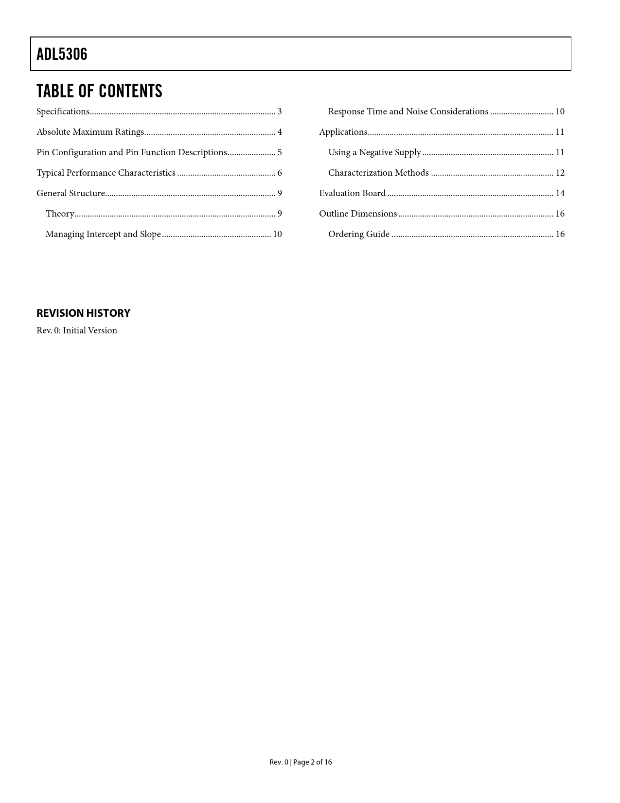 link to page 3 link to page 4 link to page 5 link to page 6 link to page 9 link to page 9 link to page 10 link to page 10 link to page 11 link to page 11 link to page 12 link to page 14 link to page 16 link to page 16 ADL5306 TABLE OF CONTENTS Specifications... 3 Response Time and Noise Considerations ... 10 Absolute Maximum Ratings.. 4 Applications... 11 Pin Configuration and Pin Function Descriptions.. 5 Using a Negative Supply .. 11 Typical Performance Characteristics ... 6 Characterization Methods .. 12 General Structure.. 9 Evaluation Board .. 14 Theory.. 9 Outline Dimensions ... 16 Managing Intercept and Slope .. 10 Ordering Guide .. 16