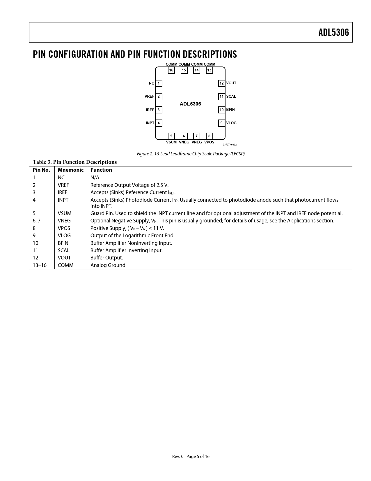 COMM COMM COMM COMM 16 15 14 13 NC 1 12 VOUT VREF 2 11 SCAL ADL5306 IREF 3 10 BFIN INPT 4 9 VLOG 5 6 7 8 VSUM VNEG VNEG VPOS 03727-0-002