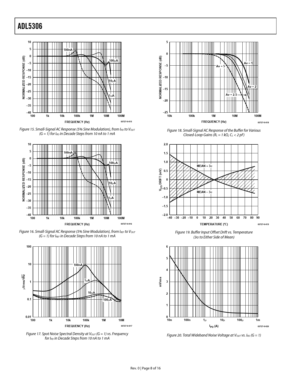 ADL5306 1055100nA0)0)BBd100 µ Ad–5Av = 1SE (SE ( –5Av = 5–10ESPONESPONR –15R –1010 µ AIZED –20IZEDLLAv = 2AA –15M –25MOR1 µ AORAv = 2.5N –30N –20–35–40–251001k10k100k1M10M100M10k100k1M10M100MFREQUENCY (Hz)03727-0-015FREQUENCY (Hz)03727-0-018 Figure 15. Small-Signal AC Response (5% Sine Modulation), from IPD to VOUT Figure 18. Small-Signal AC Response of the Buffer for Various (G = 1) for IPD in Decade Steps from 10 nA to 1 mA Closed-Loop Gains (RL = 1 kΩ, CL < 2 pF) 102.05100nA1.5)0B d100 µ A1.0–5MEAN + 3 σ SE () 0.5–10ESPON R –15010 µ ADRIFT (mVIZED –20LOS–0.5AVMEAN – 3 σ M –25 OR1 µ A–1.0N –30–1.5–35–40–2.01001k10k100k1M10M100M–40 –30 –20 –1001020 304050607080 90FREQUENCY (Hz)03727-0-016TEMPERATURE (°C)03727-0-019 Figure 16. Small-Signal AC Response (5% Sine Modulation), from IREF to VOUT Figure 19. Buffer Input Offset Drift vs. Temperature (G = 1) for IREF in Decade Steps from 10 nA to 1 mA (3σ to Either Side of Mean) 1006510100nA411 µ A3mVrms µ Vrms/ Hz10 µ A20.1100 µ A10.0101001k10k100k1M10M10n100n1 µ 10 µ 100 µ 1mFREQUENCY (Hz)03727-0-017IPD (A)03727-0-020 Figure 17. Spot Noise Spectral Density at VOUT (G = 1) vs. Frequency Figure 20. Total Wideband Noise Voltage at VOUT vs. IPD (G = 1) for IPD in Decade Steps from 10 nA to 1 mA Rev. 0 | Page 8 of 16 Document Outline FEATURES APPLICATIONS GENERAL DESCRIPTION FUNCTIONAL BLOCK DIAGRAM TABLE OF CONTENTS SPECIFICATIONS ABSOLUTE MAXIMUM RATINGS PIN CONFIGURATION AND PIN FUNCTION DESCRIPTIONS TYPICAL PERFORMANCE CHARACTERISTICS GENERAL STRUCTURE THEORY MANAGING INTERCEPT AND SLOPE RESPONSE TIME AND NOISE CONSIDERATIONS APPLICATIONS USING A NEGATIVE SUPPLY CHARACTERIZATION METHODS EVALUATION BOARD OUTLINE DIMENSIONS ORDERING GUIDE
