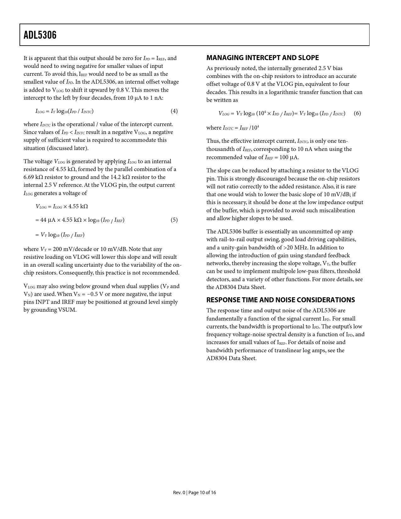 by grounding VSUM. The response time and output noise of the ADL5306 are fundamentally a function of the signal current IPD. For small currents, the bandwidth is proportional to IPD. The output’s low frequency voltage-noise spectral density is a function of IPD, and increases for small values of IREF. For details of noise and bandwidth performance of translinear log amps, see the AD8304 Data Sheet. Rev. 0 | Page 10 of 16 Document Outline FEATURES APPLICATIONS GENERAL DESCRIPTION FUNCTIONAL BLOCK DIAGRAM TABLE OF CONTENTS SPECIFICATIONS ABSOLUTE MAXIMUM RATINGS PIN CONFIGURATION AND PIN FUNCTION DESCRIPTIONS TYPICAL PERFORMANCE CHARACTERISTICS GENERAL STRUCTURE THEORY MANAGING INTERCEPT AND SLOPE RESPONSE TIME AND NOISE CONSIDERATIONS APPLICATIONS USING A NEGATIVE SUPPLY CHARACTERIZATION METHODS EVALUATION BOARD OUTLINE DIMENSIONS ORDERING GUIDE