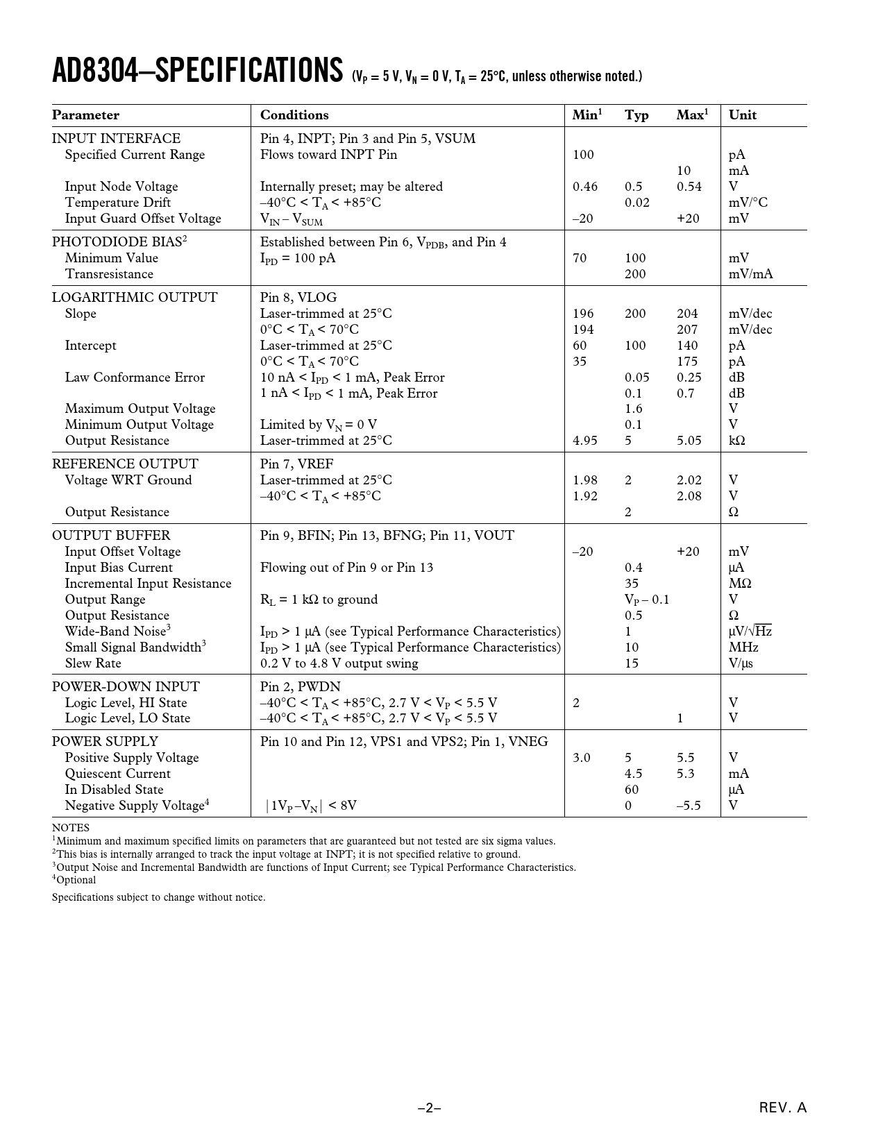 AD8304–SPECIFICATIONS (VP = 5 V, VN = 0 V, TA = 25 C, unless otherwise noted.) Parameter Conditions Min1 Typ Max1 Unit