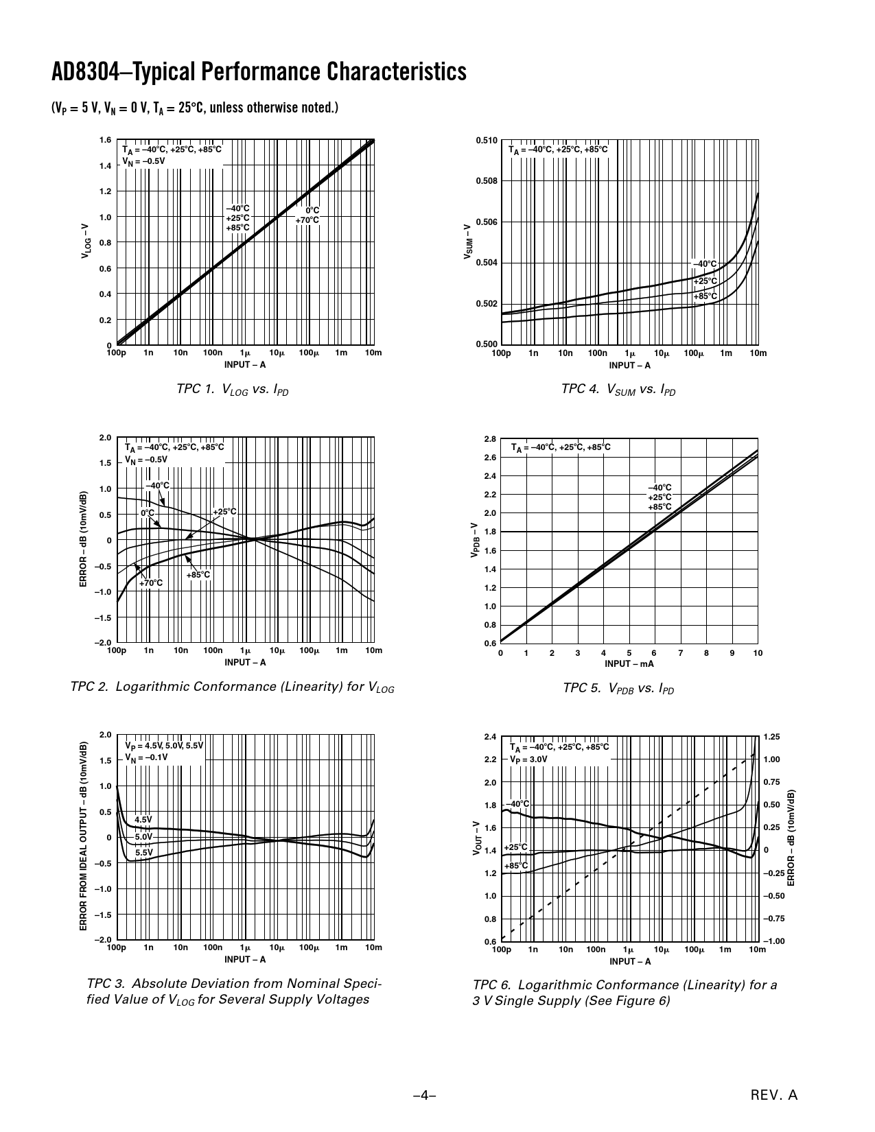 AD8304–Typical Performance Characteristics(VP = 5 V, VN = 0 V, TA = 25C, unless otherwise noted.)1.60.510TA = –40C, +25C, +85CTA = –40C, +25C, +85CV1.4N = –0.5V0.5081.2–40C0C1.0+25C+70C0.506V+85CV––0.8LOGSUMVV 0.504–40C0.6+25C0.4+85C0.5020.200.500100p1n10n100n1101001m10m100p1n10n100n1101001m10mINPUT – AINPUT – A TPC 1. VLOG vs. IPD TPC 4. VSUM vs. IPD 2.02.8TA = –40C, +25C, +85CTA = –40C, +25C, +85C2.61.5VN = –0.5V2.41.0–40C–40C2.2+25C +85C0.50+25CC2.0V – 1.80PDB 1.6VOR – dB (10mV/dB)–0.51.4+85CERR+70C1.2–1.01.0–1.50.8–2.00.6100p1n10n100n1101001m10m012345678910INPUT – AINPUT – mA TPC 2. Logarithmic Conformance (Linearity) for VLOG TPC 5. VPDB vs. IPD 2.02.41.25VP = 4.5V, 5.0V, 5.5VTA = –40C, +25C, +85C1.5VN = –0.1V2.2V1.00P = 3.0V0.751.02.01.8–40C0.500.54.5VV 1.60.25–05.0VOUT+25C5.5VV 1.40–0.5+85COR – dB (10mV/dB)1.2–0.25OM IDEAL OUTPUT – dB (10mV/dB)ERR–1.01.0–0.50OR FR–1.50.8–0.75ERR–2.00.6–1.00100p1n10n100n1101001m10m100p1n10n100n1101001m10mINPUT – AINPUT – A TPC 3. Absolute Deviation from Nominal Speci- TPC 6. Logarithmic Conformance (Linearity) for a fied Value of VLOG for Several Supply Voltages 3 V Single Supply (See Figure 6) –4– REV. A Document Outline FEATURES APPLICATIONS PRODUCT DESCRIPTION FUNCTIONAL BLOCK DIAGRAM SPECIFICATIONS ABSOLUTE MAXIMUM RATINGS PIN CONFIGURATION PIN FUNCTION DESCRIPTIONS ORDERING GUIDE Typical Performance Characteristics BASIC CONCEPTS Optical Measurements Decibel Scaling GENERAL STRUCTURE Bandwidth and Noise Considerations Chip Enable USING THE AD8304 Slope and Intercept Adjustments Low Supply Slope and Intercept Adjustment Using the Adaptive Bias Changing the Voltage at the Summing Node Implementing Low-Pass Filters Operation in Comparator Modes Using a Negative Supply APPLICATIONS Summing Node at Ground and Voltage Inputs Providing Negative Outputs and Rescaling Inverting the Slope Programmable Level Comparator with Hysteresis Programmable Multidecade Current Source Characterization Setups and Methods Evaluation Board OUTLINE DIMENSIONS Revision History
