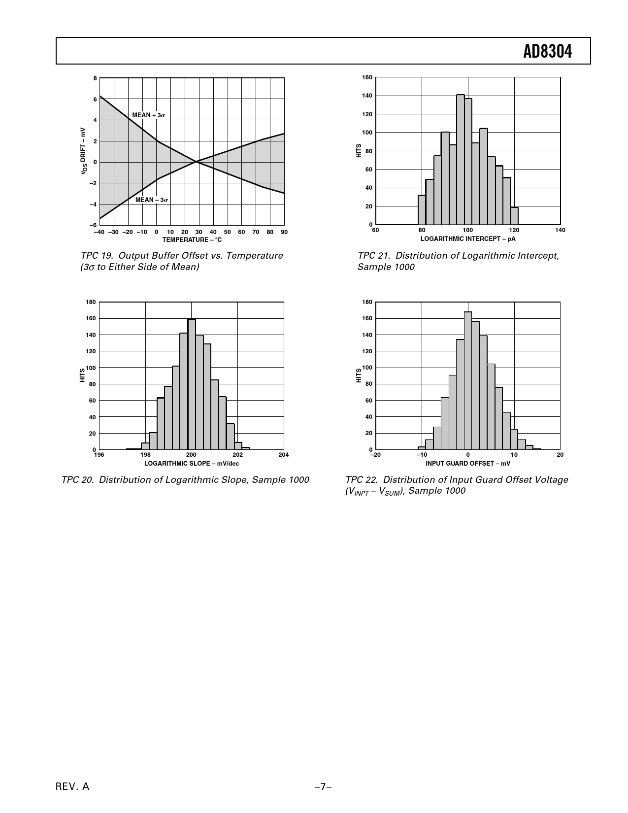 AD8304 160 140 MEAN + 3 120 100 HITS DRIFT – mV MEAN – 3 –40 –30 –20 –10 TEMPERATURE – LOGARITHMIC INTERCEPT – pA 180 196 198 200 202