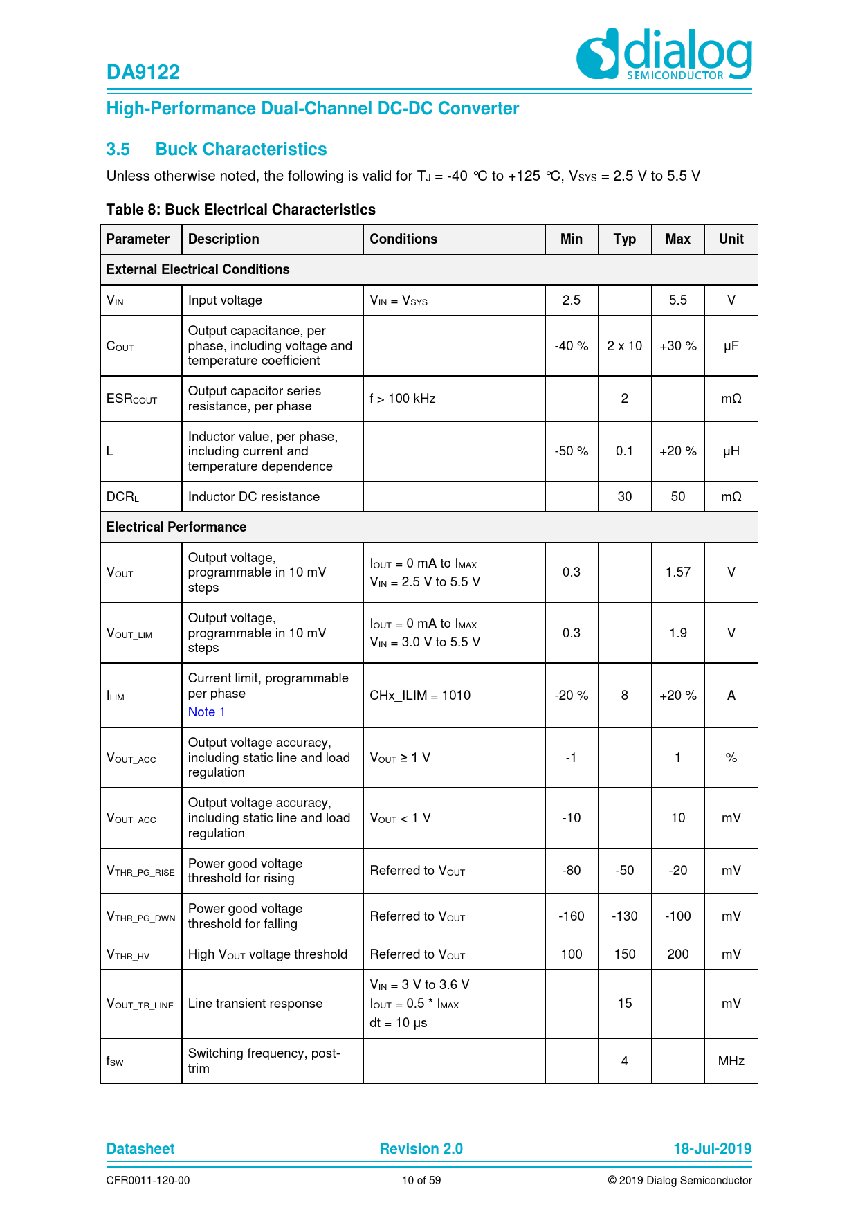 DA9122. High-Performance Dual-Channel DC-DC Converter. 3.5. Buck Characteristics. Table 8: Buck Electrical Characteristics