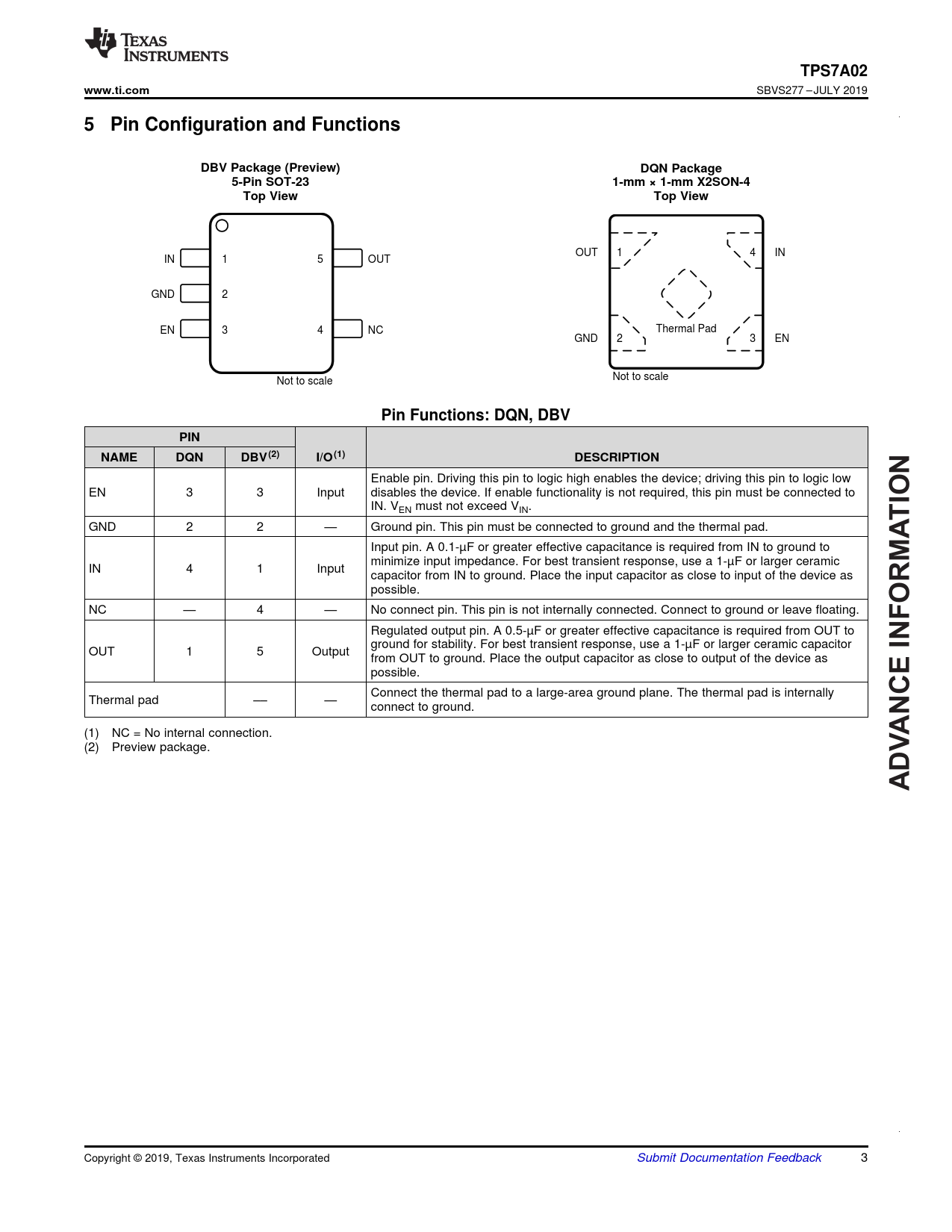 TPS7A02. www.ti.com. 5 Pin Configuration and Functions. DBV Package (Preview). DQN Package. 5-Pin SOT-23. 1-mm × 1-mm X2SON-4