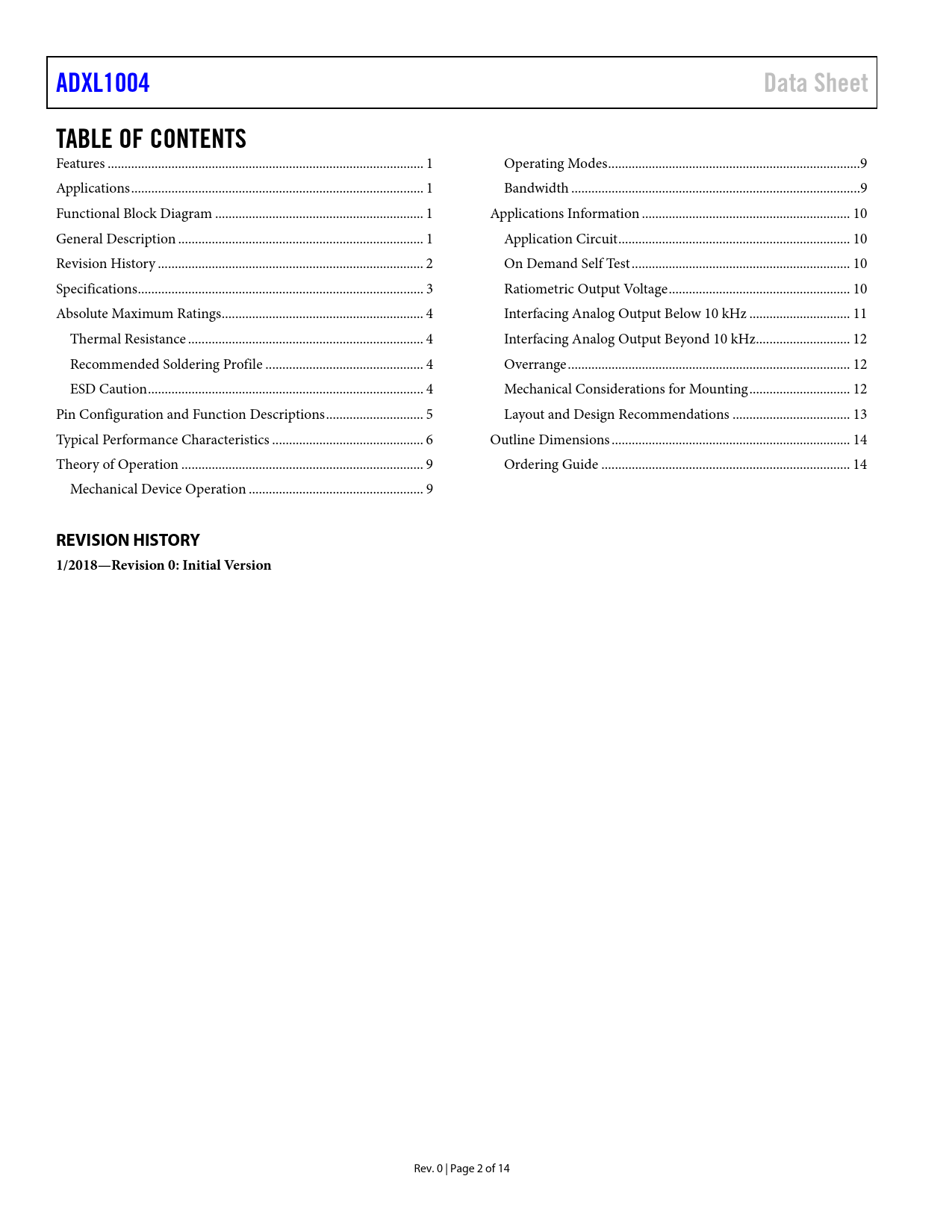link to page 1 link to page 1 link to page 1 link to page 1 link to page 2 link to page 3 link to page 4 link to page 4 link to page 4 link to page 4 link to page 5 link to page 6 link to page 9 link to page 9 link to page 9 link to page 9 link to page 10 link to page 10 link to page 10 link to page 10 link to page 11 link to page 12 link to page 12 link to page 12 link to page 13 link to page 14 link to page 14 ADXL1004Data SheetTABLE OF CONTENTS Features .. 1 Operating Modes ...9 Applications ... 1 Bandwidth ..9 Functional Block Diagram .. 1 Applications Information .. 10 General Description ... 1 Application Circuit ... 10 Revision History ... 2 On Demand Self Test ... 10 Specifications ... 3 Ratiometric Output Voltage .. 10 Absolute Maximum Ratings .. 4 Interfacing Analog Output Below 10 kHz .. 11 Thermal Resistance .. 4 Interfacing Analog Output Beyond 10 kHz .. 12 Recommended Soldering Profile ... 4 Overrange .. 12 ESD Caution .. 4 Mechanical Considerations for Mounting .. 12 Pin Configuration and Function Descriptions ... 5 Layout and Design Recommendations ... 13 Typical Performance Characteristics ... 6 Outline Dimensions ... 14 Theory of Operation .. 9 Ordering Guide .. 14 Mechanical Device Operation .. 9 REVISION HISTORY 1/2018—Revision 0: Initial Version Rev. 0 | Page 2 of 14 Document Outline Features Applications Functional Block Diagram General Description Revision History Specifications Absolute Maximum Ratings Thermal Resistance Recommended Soldering Profile ESD Caution Pin Configuration and Function Descriptions Typical Performance Characteristics Theory of Operation Mechanical Device Operation Operating Modes Measurement Mode Standby Mode Bandwidth Applications Information Application Circuit On Demand Self Test Ratiometric Output Voltage Interfacing Analog Output Below 10 kHz Interfacing Analog Output Beyond 10 kHz Overrange Mechanical Considerations for Mounting Layout and Design Recommendations Outline Dimensions Ordering Guide Untitled