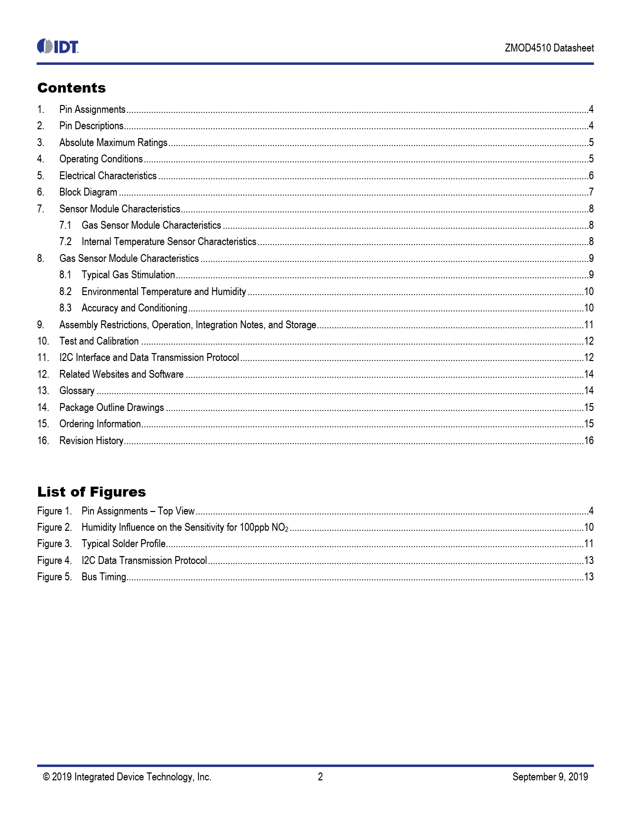 1. Pin Assignments ...4 2. Pin Descriptions ..4 3. Absolute Maximum Ratings ..5 4. Operating Conditions ..5 5. Electrical Characteristics ..6 6. Block Diagram ..7 7. Sensor Module Characteristics ...8 7.1 Gas Sensor Module Characteristics ..8 7.2 Internal Temperature Sensor Characteristics ..8 8. Gas Sensor Module Characteristics ...9 8.1 Typical Gas Stimulation ...9 8.2 Environmental Temperature and Humidity ..10 8.3 Accuracy and Conditioning ..10 9. Assembly Restrictions, Operation, Integration Notes, and Storage ..11 10. Test and Calibration ...12 11. I2C Interface and Data Transmission Protocol ...12 12. Related Websites and Software ...14 13. Glossary ...14 14. Package Outline Drawings ...15 15. Ordering Information ...15 16. Revision History ..16