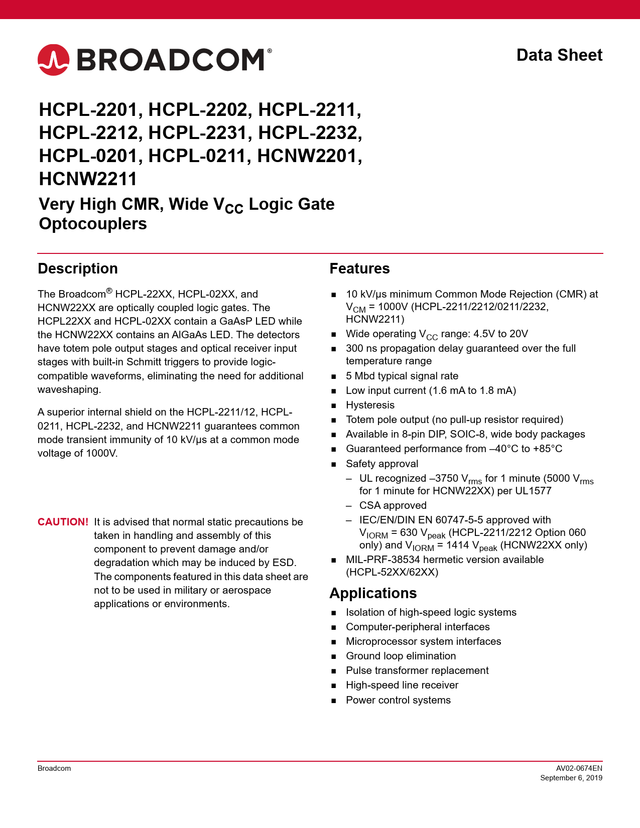 applications or environments. Isolation of high-speed logic systems Computer-peripheral interfaces Microprocessor system interfaces Ground loop elimination Pulse transformer replacement High-speed line receiver Power control systems Broadcom AV02-0674EN September 6, 2019 Document Outline Description Features Applications Functional Diagram Selection Guide Schematic Ordering Information Package Outline Drawings 8-Pin DIP Package (HCPL-2201/02/11/12/31/32) 8-Pin DIP Package with Gull Wing Surface Mount Option 300 (HCPL-2201/02/11/12/31/32) Small-Outline SO-8 Package (HCPL-0201/11) 8-Pin Widebody DIP Package (HCNW2201/11) 8-Pin Widebody DIP Package with Gull Wing Surface Mount Option 300 (HCNW2201/11) Solder Reflow Profile Regulatory Information Insulation and Safety Related Specifications IEC/EN/DIN EN 60747-5-5 Insulation Characteristics (Option 060) IEC/EN/DIN EN 60747-5-5 Insulation Characteristics (HCNW22xx Option 060 ONLY) Absolute Maximum Ratings Recommended Operating Conditions Electrical Specifications Switching Specifications (AC) Package Characteristics