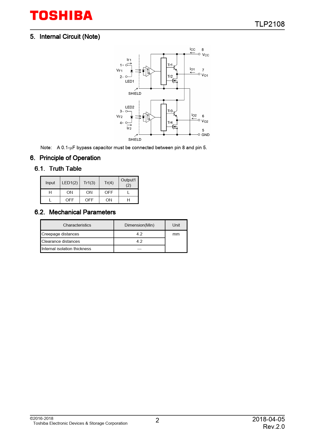 TLP2108 5. Internal Circuit (Note) Note: A 0.1-µF bypass capacitor must be connected between pin 8 and pin 5. 6. Principle of Operation 6.1. Truth Table Output1 Input LED1(2) Tr1(3) Tr(4) (2) H ON ON OFF L L OFF OFF ON H 6.2. Mechanical Parameters Characteristics Dimension(Min) Unit Creepage distances 4.2 mm Clearance distances 4.2 Internal isolation thickness ©2016-2018 2 2018-04-05 Toshiba Electronic Devices & Storage Corporation Rev.2.0
