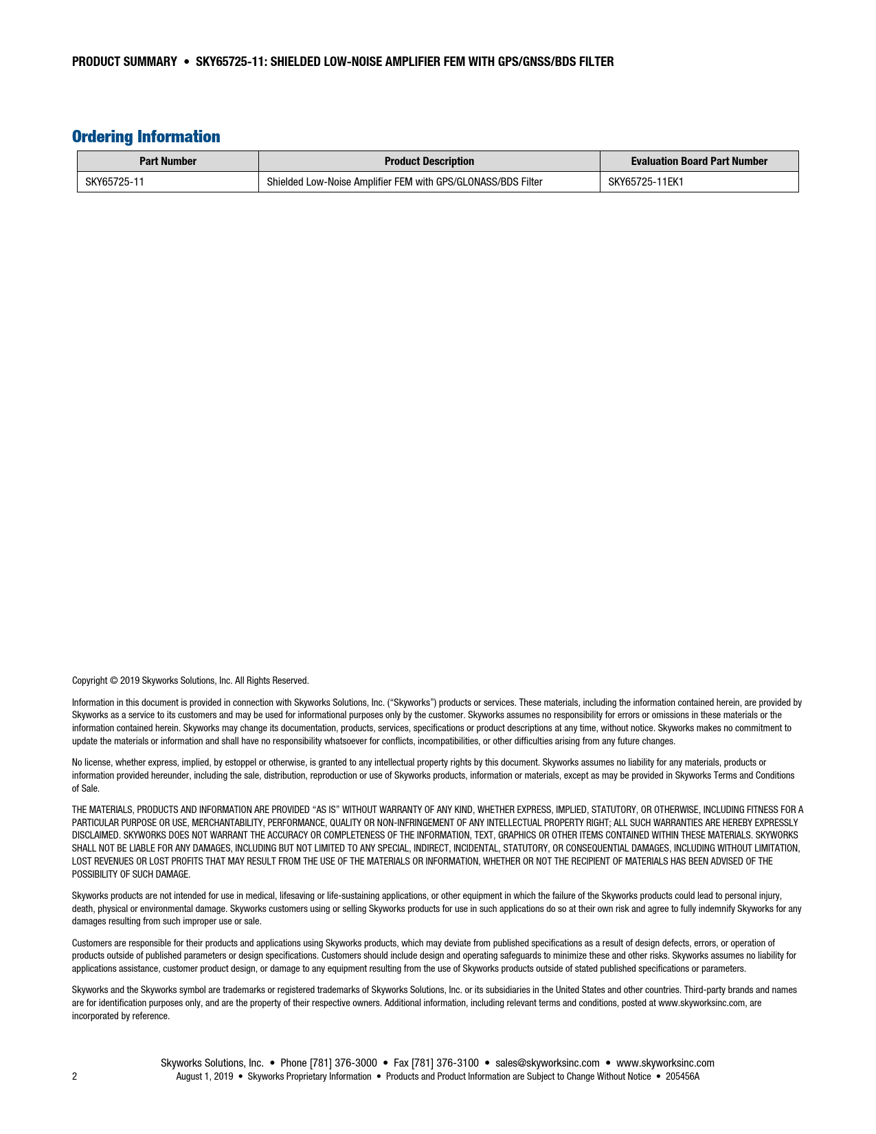 PRODUCT SUMMARY • SKY65725-11: SHIELDED LOW-NOISE AMPLIFIER FEM WITH GPS/GNSS/BDS FILTER. Ordering Information. Part Number