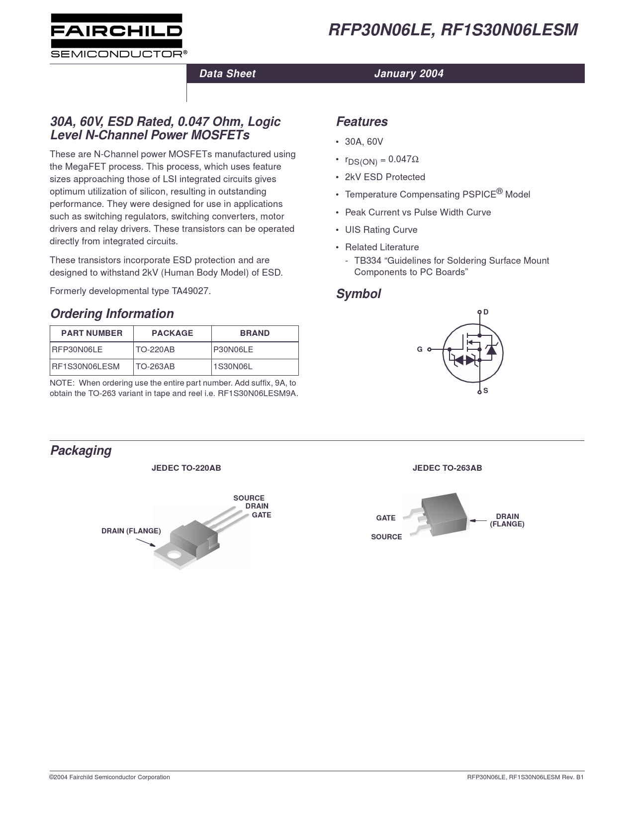 RFP30N06LE, RF1S30N06LESM Data Sheet January 2004 30A, 60V, ESD Rated, 0.047 Ohm, Logic Features Level N-Channel Power MOSFETs