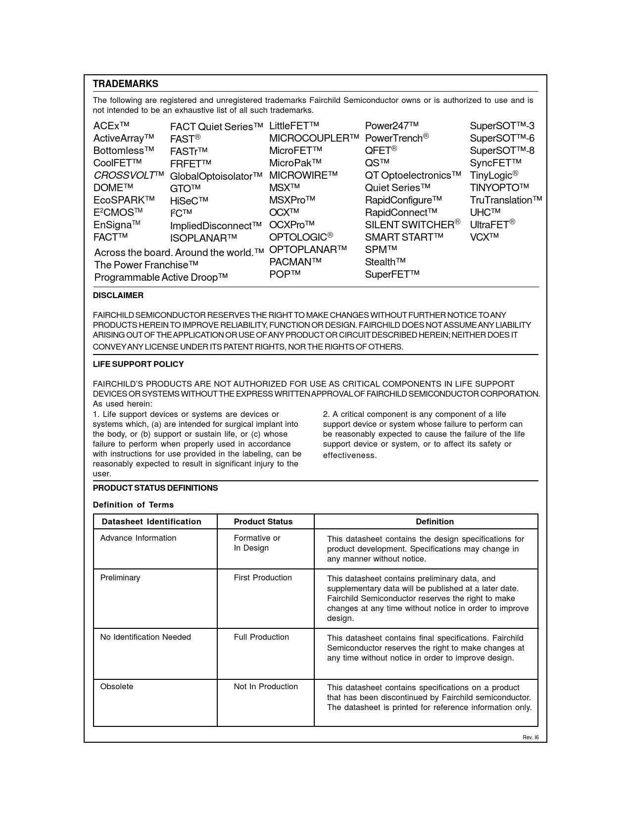 TRADEMARKS The following are registered and unregistered trademarks Fairchild Semiconductor owns or is authorized to use and is not intended to be an exhaustive list of all such trademarks. ACEx™ FACT Quiet Series™ LittleFET™ Power247™ SuperSOT™-3 ActiveArray™ FAST MICROCOUPLER™ PowerTrench SuperSOT™-6 Bottomless™ FASTr™ MicroFET™ QFET SuperSOT™-8 CoolFET™ FRFET™ MicroPak™ QS™ SyncFET™ CROSSVOLT™ GlobalOptoisolator™ MICROWIRE™ QT Optoelectronics™ TinyLogic DOME™ GTO™ MSX™ Quiet Series™ TINYOPTO™ EcoSPARK™ HiSeC™ MSXPro™ RapidConfigure™ TruTranslation™ E2CMOSTM I2C™ OCX™ RapidConnect™ UHC™ EnSignaTM ImpliedDisconnect™ OCXPro™ SILENT SWITCHER UltraFET FACT™ ISOPLANAR™ OPTOLOGIC SMART START™ VCX™ OPTOPLANAR™ SPM™ Across the board. Around the world.™ PACMAN™ Stealth™ The Power Franchise™ POP™ SuperFET™ Programmable Active Droop™ DISCLAIMER FAIRCHILD SEMICONDUCTOR RESERVES THE RIGHT TO MAKE CHANGES WITHOUT FURTHER NOTICE TO ANY PRODUCTS HEREIN TO IMPROVE RELIABILITY, FUNCTION OR DESIGN. FAIRCHILD DOES NOT ASSUME ANY LIABILITY ARISING OUT OF THE APPLICATION OR USE OF ANY PRODUCT OR CIRCUIT DESCRIBED HEREIN; NEITHER DOES IT CONVEY ANY LICENSE UNDER ITS PATENT RIGHTS, NOR THE RIGHTS OF OTHERS. LIFE SUPPORT POLICY FAIRCHILD’S PRODUCTS ARE NOT AUTHORIZED FOR USE AS CRITICAL COMPONENTS IN LIFE SUPPORT DEVICES OR SYSTEMS WITHOUT THE EXPRESS WRITTEN APPROVAL OF FAIRCHILD SEMICONDUCTOR CORPORATION. As used herein: 1. Life support devices or systems are devices or 2. A critical component is any component of a life systems which, (a) are intended for surgical implant into support device or system whose failure to perform can the body, or (b) support or sustain life, or (c) whose be reasonably expected to cause the failure of the life failure to perform when properly used in accordance support device or system, or to affect its safety or with instructions for use provided in the labeling, can be effectiveness. reasonably expected to result in significant injury to the user. PRODUCT STATUS DEFINITIONSDefinition of TermsDatasheet IdentificationProduct StatusDefinition Advance Information Formative or This datasheet contains the design specifications for In Design product development. Specifications may change in any manner without notice. Preliminary First Production This datasheet contains preliminary data, and supplementary data will be published at a later date. Fairchild Semiconductor reserves the right to make changes at any time without notice in order to improve design. No Identification Needed Full Production This datasheet contains final specifications. Fairchild Semiconductor reserves the right to make changes at any time without notice in order to improve design. Obsolete Not In Production This datasheet contains specifications on a product that has been discontinued by Fairchild semiconductor. The datasheet is printed for reference information only. Rev. I6
