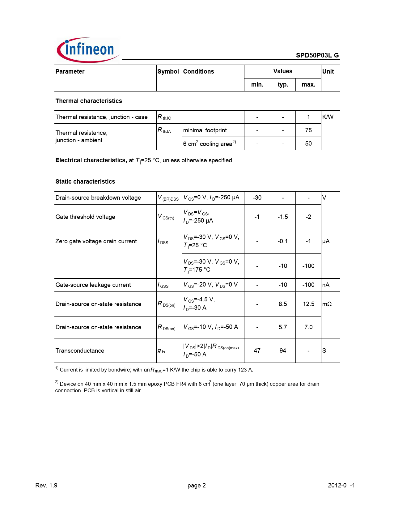 SPD50P03L G. Parameter. Symbol Conditions. Values. Unit. min. typ. max. Thermal characteristics. Electrical characteristics,