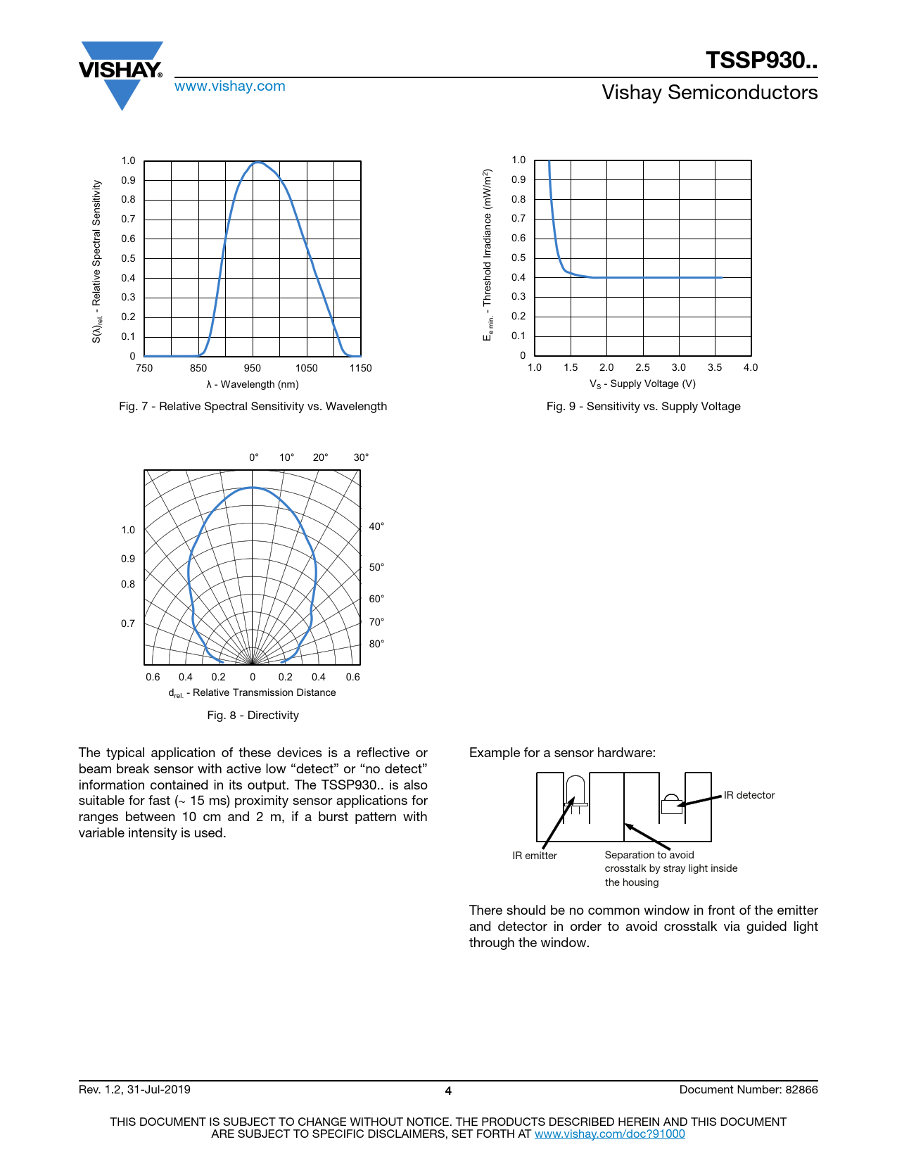 TSSP930.. www.vishay.com Vishay Semiconductors Axis Title Axis Title 1.0 10000 1.0 10000 )2 0.9 0.9 ity /m tiv W 0.8 0.8 nsi (m e 0.7 0.7 S 1000 1000 ance 0.6 0.6 ectral ne ne ine ne ine ne p rradi 0.5 0.5 d I e S 1st li 2nd li 2nd l 1st li 2nd l v 2nd li 0.4 0.4 100 100 elati 0.3 hreshol 0.3 R T - - l. 0.2 0.2 λ) re 0.1 e min. S( 0.1 E 0 10 0 10 750 850 950 1050 1150 1.0 1.5 2.0 2.5 3.0 3.5 4.0 λ - Wavelength (nm) V - Supply Voltage (V) S Fig. 7 - Relative Spectral Sensitivity vs. Wavelength Fig. 9 - Sensitivity vs. Supply Voltage Axis Tit 0° le 10° 20° 30° 1.0 40° 0.9 ne ne ine ine 50° 2nd l 2nd l 2nd li 2nd li 0.8 60° 0.7 70° 80° 0.6 0.4 0.2 0 0.2 0.4 0.6 d - Relative Transmission Distance rel. Fig. 8 - Directivity The typical application of these devices is a reflective or Example for a sensor hardware: beam break sensor with active low “detect” or “no detect” information contained in its output. The TSSP930.. is also suitable for fast (~ 15 ms) proximity sensor applications for IR detector ranges between 10 cm and 2 m, if a burst pattern with variable intensity is used. IR emitter Separation to avoid crosstalk by stray light inside the housing There should be no common window in front of the emitter and detector in order to avoid crosstalk via guided light through the window. Rev. 1.2, 31-Jul-2019 4 Document Number: 82866 THIS DOCUMENT IS SUBJECT TO CHANGE WITHOUT NOTICE. THE PRODUCTS DESCRIBED HEREIN AND THIS DOCUMENT ARE SUBJECT TO SPECIFIC DISCLAIMERS, SET FORTH AT www.vishay.com/doc?91000