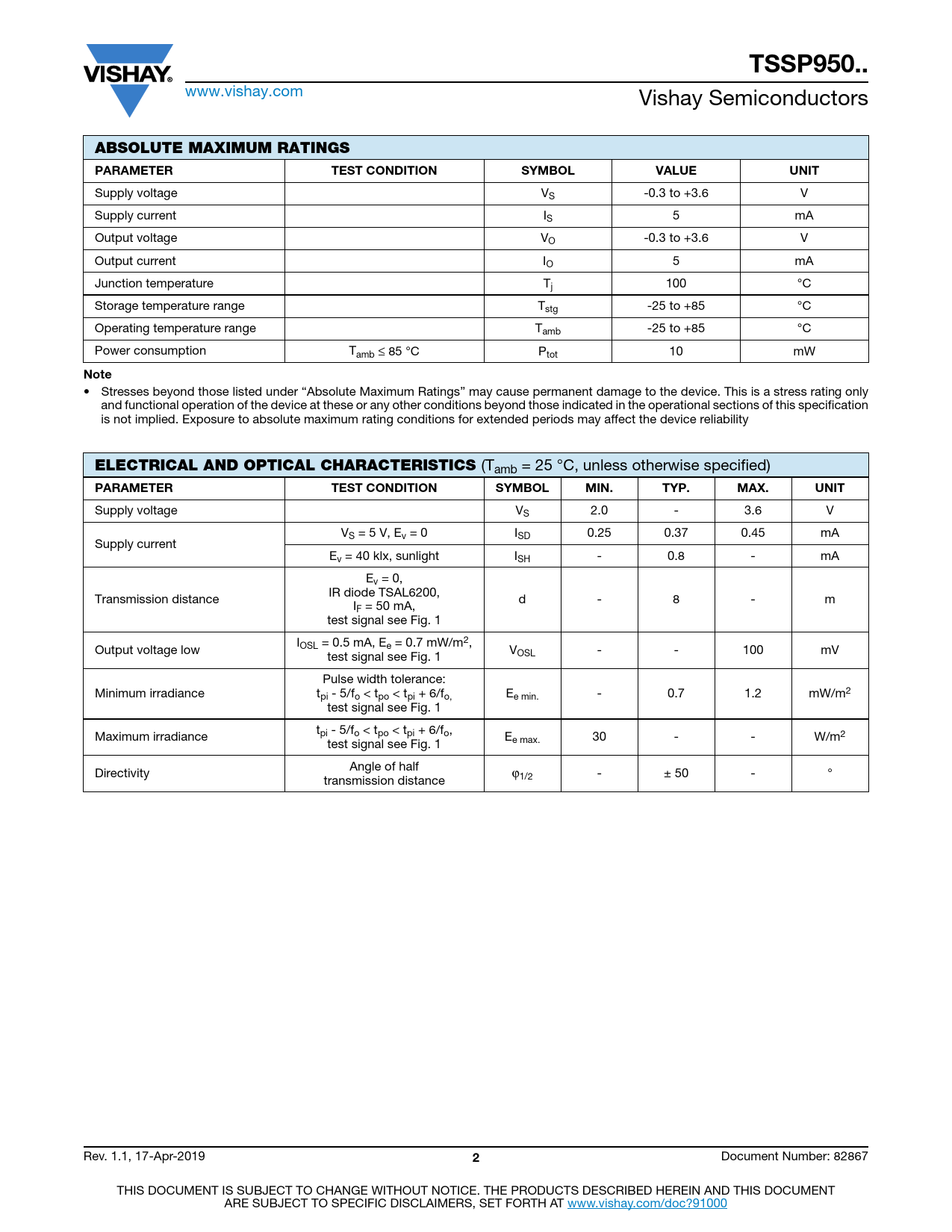 TSSP950.. www.vishay.com Vishay Semiconductors ABSOLUTE MAXIMUM RATINGS PARAMETERTEST CONDITIONSYMBOLVALUEUNIT Supply voltage VS -0.3 to +3.6 V Supply current IS 5 mA Output voltage VO -0.3 to +3.6 V Output current IO 5 mA Junction temperature Tj 100 °C Storage temperature range Tstg -25 to +85 °C Operating temperature range Tamb -25 to +85 °C Power consumption Tamb ≤ 85 °C Ptot 10 mW Note • Stresses beyond those listed under “Absolute Maximum Ratings” may cause permanent damage to the device. This is a stress rating only and functional operation of the device at these or any other conditions beyond those indicated in the operational sections of this specification is not implied. Exposure to absolute maximum rating conditions for extended periods may affect the device reliability ELECTRICAL AND OPTICAL CHARACTERISTICS (Tamb = 25 °C, unless otherwise specified) PARAMETERTEST CONDITIONSYMBOLMIN.TYP.MAX.UNIT Supply voltage VS 2.0 - 3.6 V VS = 5 V, Ev = 0 ISD 0.25 0.37 0.45 mA Supply current Ev = 40 klx, sunlight ISH - 0.8 - mA Ev = 0, IR diode TSAL6200, Transmission distance d - 8 - m IF = 50 mA, test signal see Fig. 1 I Output voltage low OSL = 0.5 mA, Ee = 0.7 mW/m2, V test signal see Fig. 1 OSL - - 100 mV Pulse width tolerance: Minimum irradiance tpi - 5/fo < tpo < tpi + 6/fo, Ee min. - 0.7 1.2 mW/m2 test signal see Fig. 1 t Maximum irradiance pi - 5/fo < tpo < tpi + 6/fo, E test signal see Fig. 1 e max. 30 - - W/m2 Angle of half Directivity ϕ 50 - ° transmission distance 1/2 - ± Rev. 1.1, 17-Apr-2019 2 Document Number: 82867 THIS DOCUMENT IS SUBJECT TO CHANGE WITHOUT NOTICE. THE PRODUCTS DESCRIBED HEREIN AND THIS DOCUMENT ARE SUBJECT TO SPECIFIC DISCLAIMERS, SET FORTH AT www.vishay.com/doc?91000