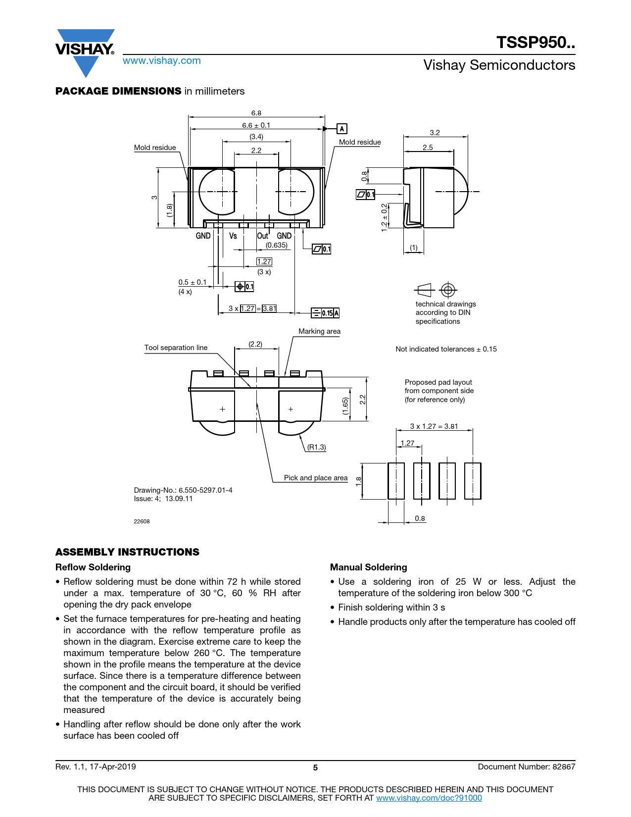 TSSP950.. www.vishay.com Vishay Semiconductors PACKAGE DIMENSIONS in millimeters 6.8 6.6 ± 0.1 3.2 (3.4) Mold residue Mold residue 2.2 2.5 0.8 3 (1.8) 1.2 ± 0.2 (0.635) (1) 1.27 (3 x) 0.5 ± 0.1 (4 x) technical drawings 3 x 1.27 = 3.81 according to DIN specifications Marking area (2.2) Tool separation line Not indicated tolerances ± 0.15 Proposed pad layout from component side 2.2 (for reference only) (1.65) 3 x 1.27 = 3.81 1.27 (R1.3) Pick and place area 1.8 Drawing-No.: 6.550-5297.01-4 Issue: 4; 13.09.11 0.8 22608 ASSEMBLY INSTRUCTIONS Reflow SolderingManual Soldering • Reflow soldering must be done within 72 h while stored • Use a soldering iron of 25 W or less. Adjust the under a max. temperature of 30 °C, 60 % RH after temperature of the soldering iron below 300 °C opening the dry pack envelope • Finish soldering within 3 s • Set the furnace temperatures for pre-heating and heating • Handle products only after the temperature has cooled off in accordance with the reflow temperature profile as shown in the diagram. Exercise extreme care to keep the maximum temperature below 260 °C. The temperature shown in the profile means the temperature at the device surface. Since there is a temperature difference between the component and the circuit board, it should be verified that the temperature of the device is accurately being measured • Handling after reflow should be done only after the work surface has been cooled off Rev. 1.1, 17-Apr-2019 5 Document Number: 82867 THIS DOCUMENT IS SUBJECT TO CHANGE WITHOUT NOTICE. THE PRODUCTS DESCRIBED HEREIN AND THIS DOCUMENT ARE SUBJECT TO SPECIFIC DISCLAIMERS, SET FORTH AT www.vishay.com/doc?91000
