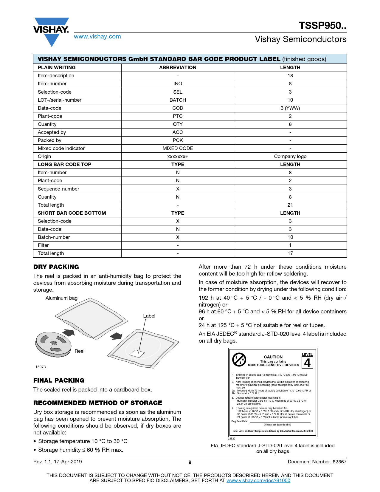 22522 • Storage temperature 10 °C to 30 °C EIA JEDEC standard J-STD-020 level 4 label is included • Storage humidity ≤ 60 % RH max. on all dry bags Rev. 1.1, 17-Apr-2019