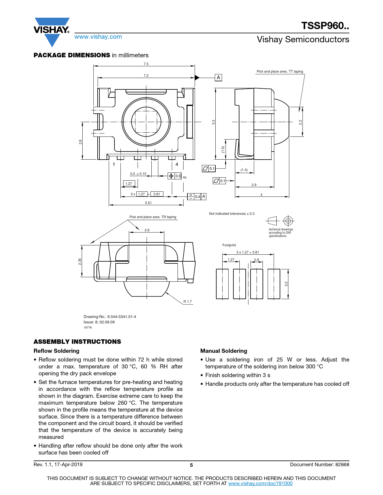 TSSP960.. www.vishay.com Vishay Semiconductors PACKAGE DIMENSIONS in millimeters 7.5 Pick and place area. TT taping 7.2 A 5.3 2.2 2.8 (1.5) 1 4 0.1 (1.4) 0.5 ± 0.15 0.3 4x 0.1 1.27 2.9 3 x 1.27 = 3.81 4 0.4 A 5.51 Not indicated tolerances ± 0.3 Pick and place area. TR taping 2.6 technical drawings according to DIN specifications Footprint 3 x 1.27 = 3.81 1.27 0.9 2.35 2.2 R 1.7 Drawing-No.: 6.544-5341.01-4 Issue: 8; 02.09.09 16776 ASSEMBLY INSTRUCTIONS Reflow SolderingManual Soldering • Reflow soldering must be done within 72 h while stored • Use a soldering iron of 25 W or less. Adjust the under a max. temperature of 30 °C, 60 % RH after temperature of the soldering iron below 300 °C opening the dry pack envelope • Finish soldering within 3 s • Set the furnace temperatures for pre-heating and heating • Handle products only after the temperature has cooled off in accordance with the reflow temperature profile as shown in the diagram. Exercise extreme care to keep the maximum temperature below 260 °C. The temperature shown in the profile means the temperature at the device surface. Since there is a temperature difference between the component and the circuit board, it should be verified that the temperature of the device is accurately being measured • Handling after reflow should be done only after the work surface has been cooled off Rev. 1.1, 17-Apr-2019 5 Document Number: 82868 THIS DOCUMENT IS SUBJECT TO CHANGE WITHOUT NOTICE. THE PRODUCTS DESCRIBED HEREIN AND THIS DOCUMENT ARE SUBJECT TO SPECIFIC DISCLAIMERS, SET FORTH AT www.vishay.com/doc?91000