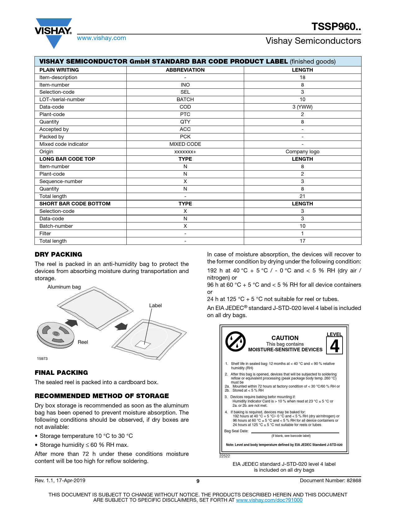 After more than 72 h under these conditions moisture 22522 content will be too high for reflow soldering. EIA JEDEC standard J-STD-020 level 4 label is included on all dry bags Rev. 1.1, 17-Apr-2019