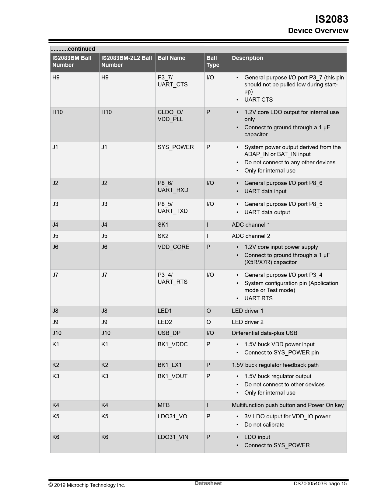 H9 H9 P3_7/ I/O • General purpose I/O port P3_7 (this pin UART_CTS should not be pulled low during start- up) • UART CTS H10 H10 CLDO_O/ P • 1.2V core LDO output for internal use VDD_PLL only • Connect to ground through a 1 μF capacitor J1 J1 SYS_POWER P • System power output derived from the ADAP_IN or BAT_IN input • Do not connect to any other devices • Only for internal use J2 J2 P8_6/ I/O • General purpose I/O port P8_6 UART_RXD • UART data input J3 J3 P8_5/ I/O • General purpose I/O port P8_5 UART_TXD • UART data output J4 J4 SK1 I ADC channel 1 J5 J5 SK2 I ADC channel 2 J6 J6 VDD_CORE P • 1.2V core input power supply • Connect to ground through a 1 μF (X5R/X7R) capacitor J7 J7 P3_4/ I/O • General purpose I/O port P3_4 UART_RTS • System configuration pin (Application mode or Test mode) • UART RTS J8 J8 LED1 O LED driver 1 J9 J9 LED2 O LED driver 2 J10 J10 USB_DP I/O Differential data-plus USB K1 K1 BK1_VDDC P • 1.5V buck VDD power input • Connect to SYS_POWER pin K2 K2 BK1_LX1 P 1.5V buck regulator feedback path K3 K3 BK1_VOUT P • 1.5V buck regulator output • Do not connect to other devices • Only for internal use K4 K4 MFB I Multifunction push button and Power On key K5 K5 LDO31_VO P • 3V LDO output for VDD_IO power • Do not calibrate K6 K6 LDO31_VIN P • LDO input • Connect to SYS_POWER © 2019 Microchip Technology Inc.