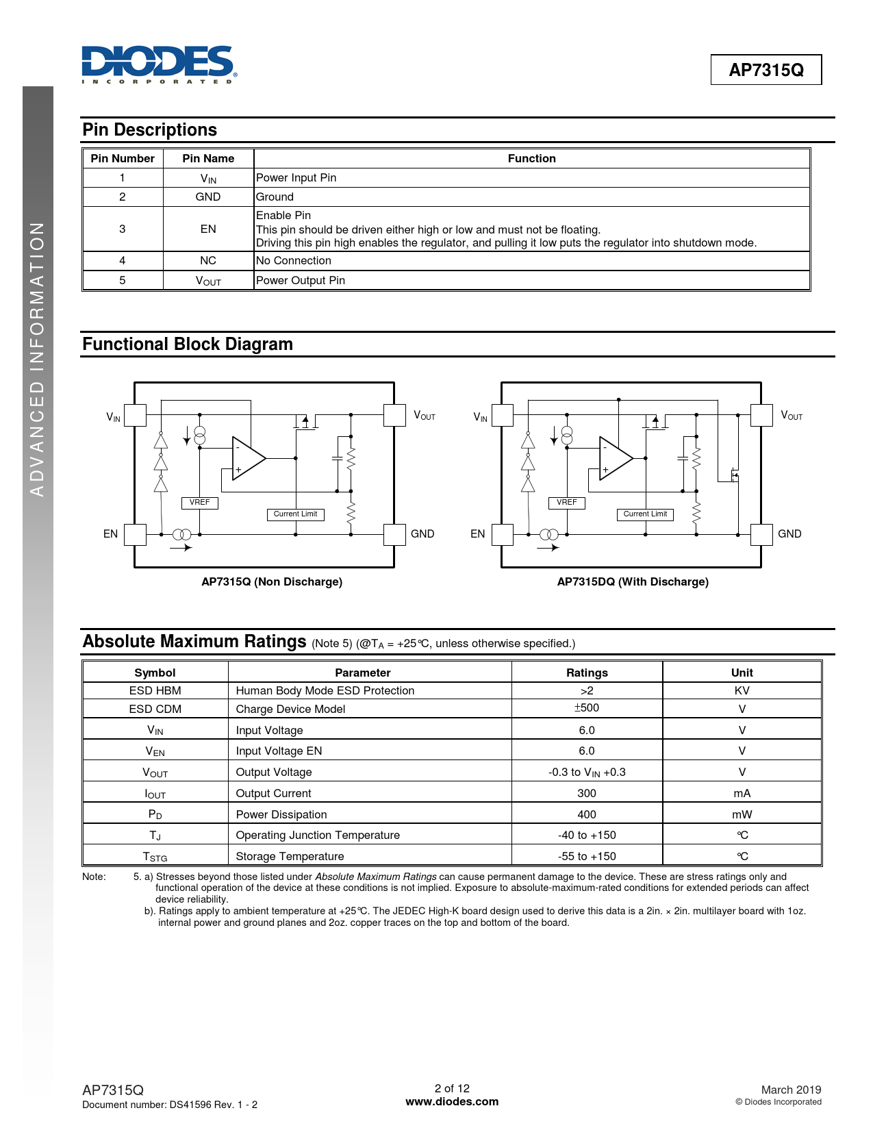 AP7315Q. Pin Descriptions. Pin Number. Pin Name. Function. Functional Block Diagram. D E C. ADVAN. AP7315Q (Non Discharge)