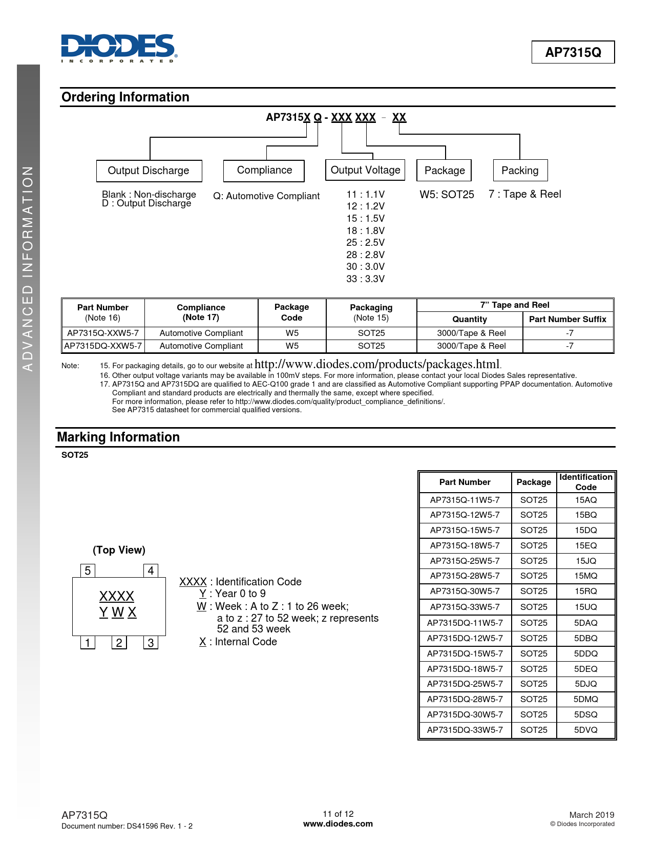 Note: 15. For packaging details, go to our website at http://www.diodes.com/products/packages.html. 16. Other output voltage variants may be available in 100mV steps. For more information, please contact your local Diodes Sales representative. 17. AP7315Q and AP7315DQ are qualified to AEC-Q100 grade 1 and are classified as Automotive Compliant supporting PPAP documentation. Automotive Compliant and standard products are electrically and thermally the same, except where specified. For more information, please refer to http://www.diodes.com/quality/product_compliance_definitions/. See AP7315 datasheet for commercial qualified versions.