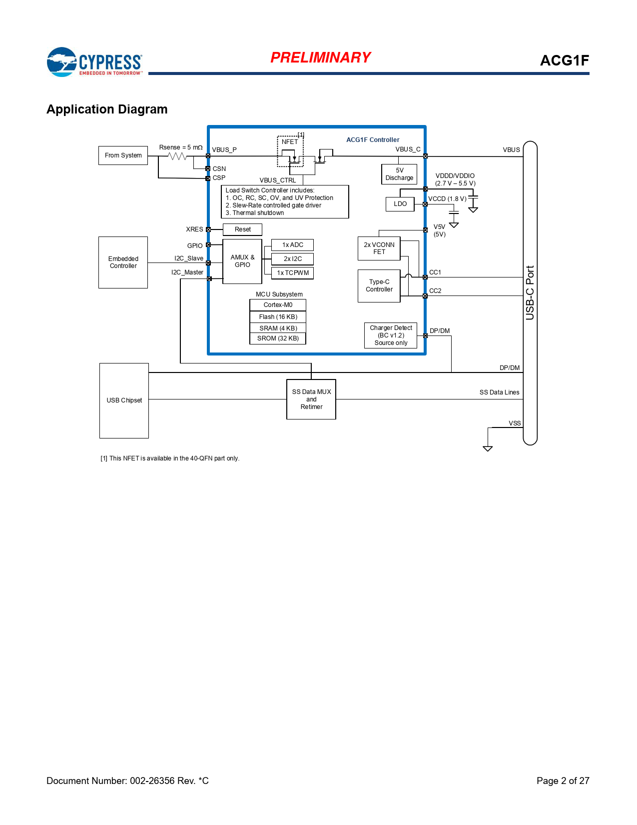Rsense = 5 m VBUS_P VBUS_C VBUS From System CSN 5V CSP Discharge VDDD/VDDIO VBUS_CTRL (2.7 V – 5.5 V) Load Switch Control er includes: 1. OC, RC, SC, OV, and UV Protection VCCD (1.8 V) 2. Slew-Rate control ed gate driver LDO 3. Thermal shutdown XRES Reset V5V (5V) GPIO 1x ADC 2x VCONN FET Embedded I2C_Slave AMUX & 2x I2C Controller GPIO I2C_Master 1x TCPWM CC1 rt Type-C Po Controller CC2 MCU Subsystem -C Cortex-M0 Flash (16 KB) USB SRAM (4 KB) Charger Detect DP/DM (BC v1.2) SROM (32 KB) Source only DP/DM SS Data MUX SS Data Lines USB Chipset and Retimer VSS [1] This NFET is available in the 40-QFN part only. Document Number: 002-26356 Rev. *C Page 2 of 27 Document Outline General Description Features USB Type-C Support Integrated VBUS Load Switch Controller 2x I2C Legacy Charging 32-bit MCU Subsystem Packages Application Diagram Contents Functional Overview USB-C Subsystem USB-PD Physical Layer VCONN FET ADC Undervoltage and Overvoltage Protection on VBUS High-side Current Sense Amplifier for VBUS VBUS Reverse Current Protection VBUS Discharge VBUS Load Switch Gate Driver for VBUS NFET Charger Detect MCU and Memory CPU Flash SROM SRAM Power System Overview Power Modes Peripherals Timer/Counter/PWM Block (TCPWM) GPIO Pinouts Electrical Specifications Absolute Maximum Ratings Device-Level Specifications CPU GPIO XRES Digital Peripherals Pulse Width Modulation (PWM) for GPIO Pins I2C Memory System Resources Power-on-Reset (POR) with Brown Out SWD Interface Internal Main Oscillator Internal Low-speed Oscillator PD Analog-to-Digital Converter Charger Detect CSA VBUS UV/OV VCONN Switch VBUS Provider NFET RCP Ordering Information Ordering Code Definition Packaging Acronyms Document Conventions Units of Measure Errata Document History Page Sales, Solutions, and Legal Information Worldwide Sales and Design Support Products PSoC® Solutions Cypress Developer Community Technical Support